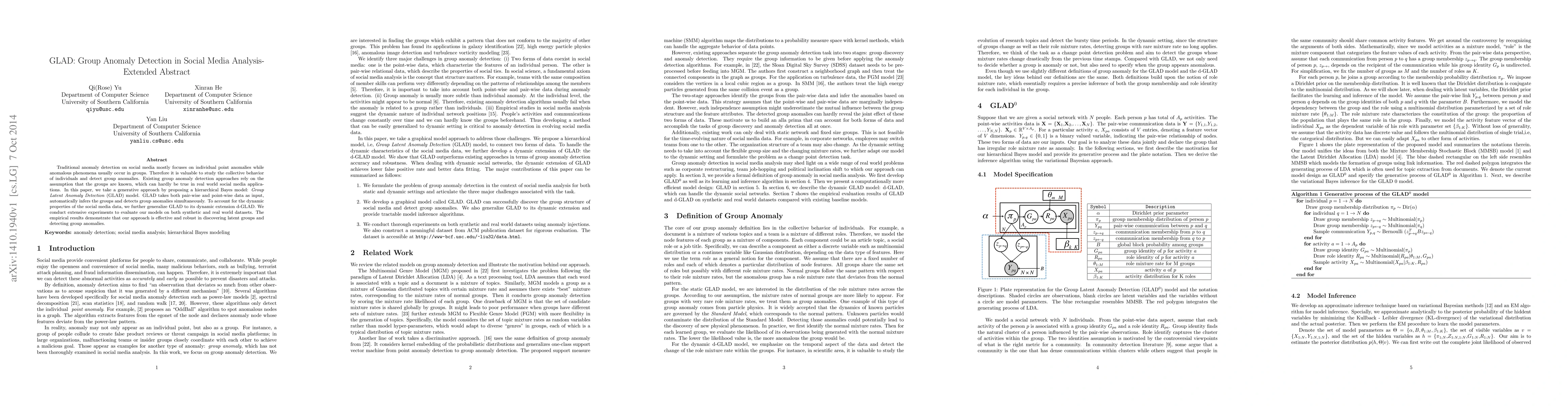 This paper proposes GLAD, a hierarchical Bayes model for group anomaly detection in social media, which automatically infers groups and detects anomalies without predefined group knowledge. The dynamic extension d-GLAD further accounts for the changing nature of social media data, demonstrating effectiveness through experiments on synthetic and real datasets.