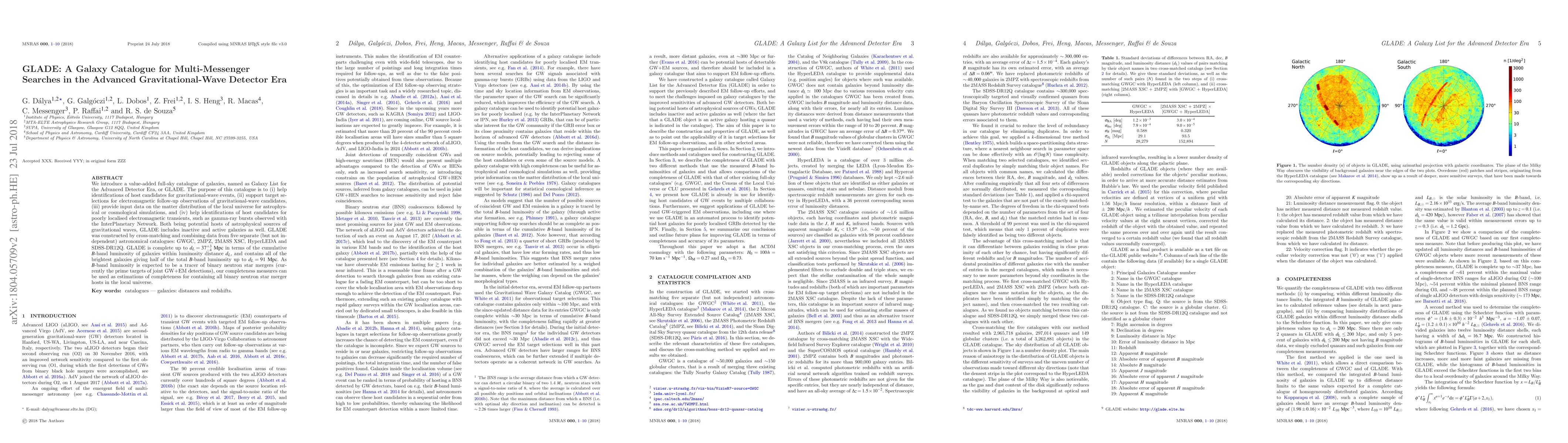 GLADE is a comprehensive galaxy catalogue designed to assist in identifying host candidates for gravitational-wave events and electromagnetic transients, constructed by cross-matching data from five astronomical catalogues, and is complete for binary neutron star merger hosts up to 37 Mpc.