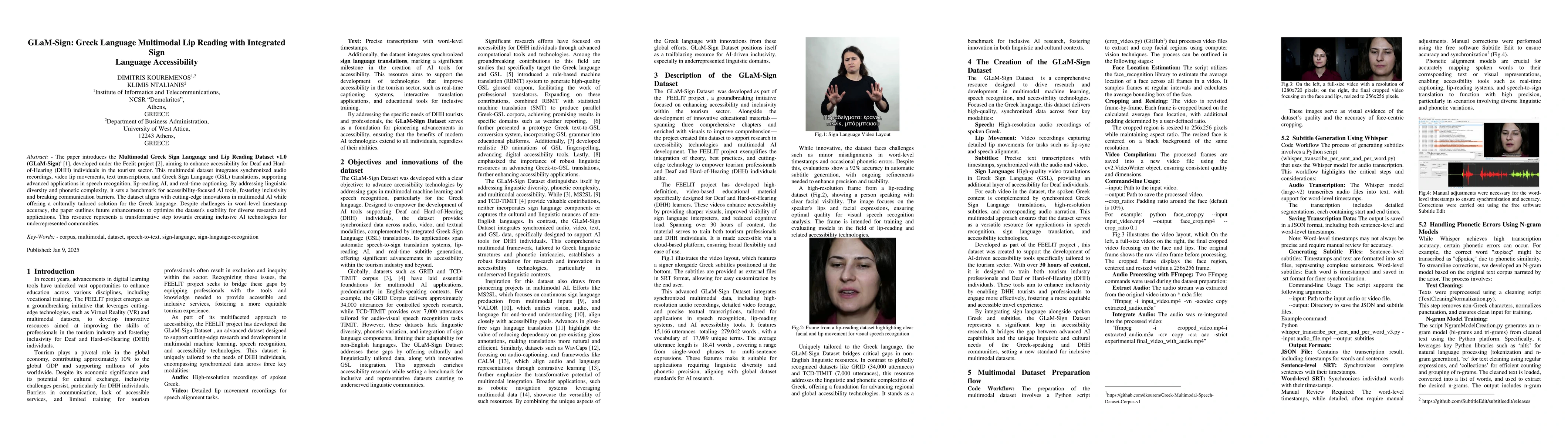 The Greek Language Multimodal Lip Reading with Integrated Sign Language Accessibility (GLaM-Sign) [1] is a groundbreaking resource in accessibility and multimodal AI, designed to support Deaf and Hard-of-Hearing (DHH) individuals. Developed from the FEELIT project [2], it integrates high-resolution audio, video, textual transcriptions, and Greek Sign Language translations for applications like real-time sign language translation and enhanced subtitle synchronization. While its primary focus is on promoting inclusivity in the Greek tourism sector, its adaptability extends to education, healthcare, and public services. Future advancements will enhance word-level precision and scalability to additional languages, supported by advanced AI methodologies and collaborations with diverse stakeholders. This dataset underscores the transformative potential of multimodal resources in bridging communication gaps, fostering innovation, and setting a benchmark for ethical AI and inclusive technologies.