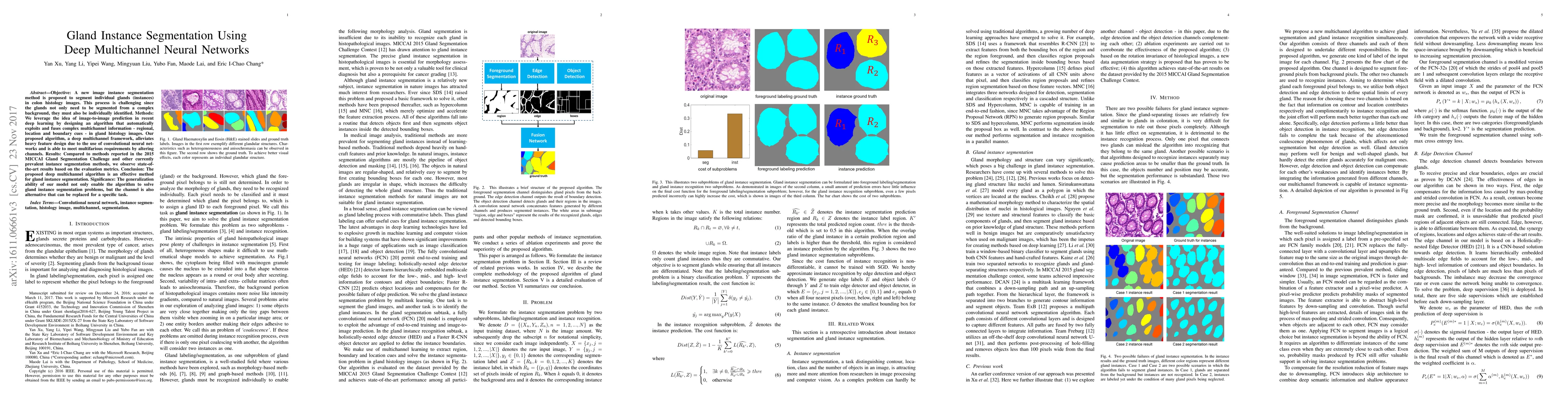 This paper proposes a deep multichannel neural network for segmenting individual glands in colon histology images, leveraging convolutional neural networks to fuse multichannel information for improved accuracy. The method achieves state-of-the-art results compared to other segmentation techniques, demonstrating effective generalization and flexibility for various tasks.