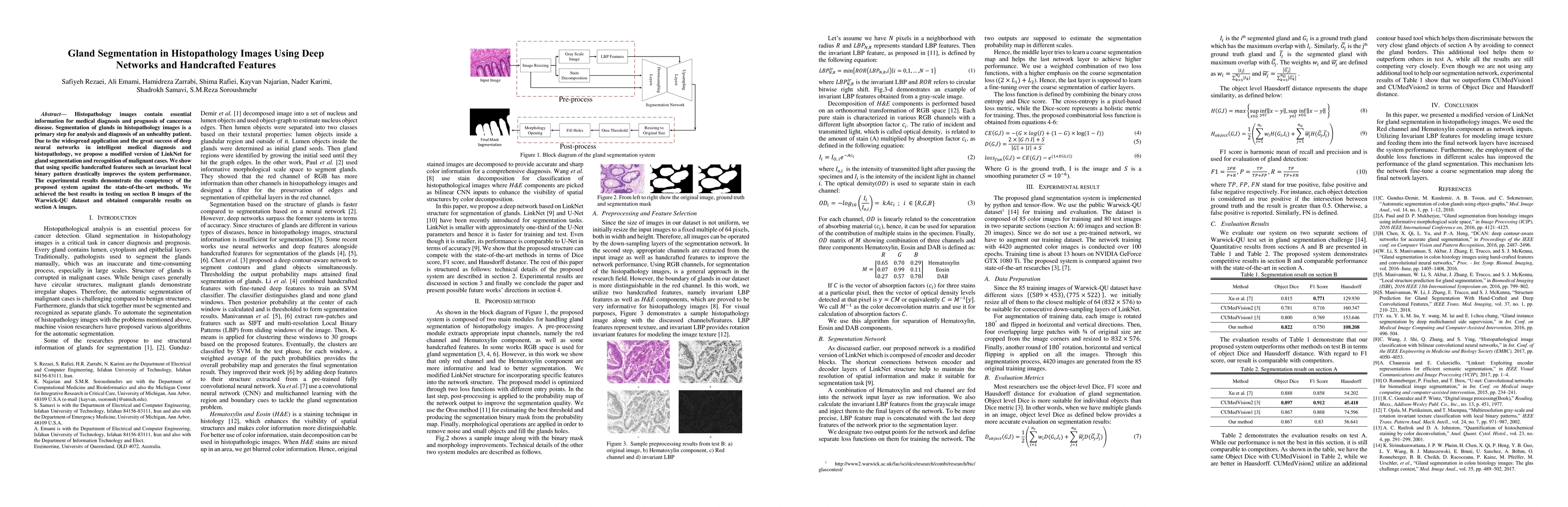 This paper proposes a modified LinkNet deep learning model for segmenting glands in histopathology images, enhanced with handcrafted features like invariant local binary patterns. Experimental results show superior performance compared to state-of-the-art methods, particularly on section B images of the Warwick-QU dataset.