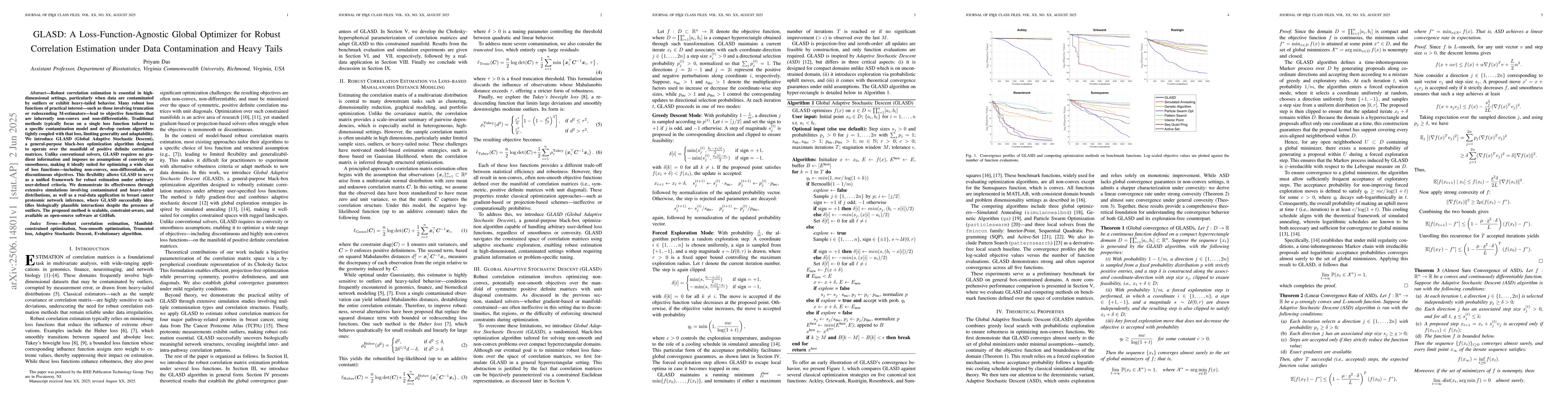 Robust correlation estimation is essential in high-dimensional settings, particularly when data are contaminated by outliers or exhibit heavy-tailed behavior. Many robust loss functions of practical interest-such as those involving truncation or redescending M-estimators-lead to objective functions that are inherently non-convex and non-differentiable. Traditional methods typically focus on a single loss function tailored to a specific contamination model and develop custom algorithms tightly coupled with that loss, limiting generality and adaptability. We introduce GLASD (Global Adaptive Stochastic Descent), a general-purpose black-box optimization algorithm designed to operate over the manifold of positive definite correlation matrices. Unlike conventional solvers, GLASD requires no gradient information and imposes no assumptions of convexity or smoothness, making it ideally suited for optimizing a wide class of loss functions-including non-convex, non-differentiable, or discontinuous objectives. This flexibility allows GLASD to serve as a unified framework for robust estimation under arbitrary user-defined criteria. We demonstrate its effectiveness through extensive simulations involving contaminated and heavy-tailed distributions, as well as a real-data application to breast cancer proteomic network inference, where GLASD successfully identifies biologically plausible interactions despite the presence of outliers. The proposed method is scalable, constraint-aware, and available as open-source software at GitHub.