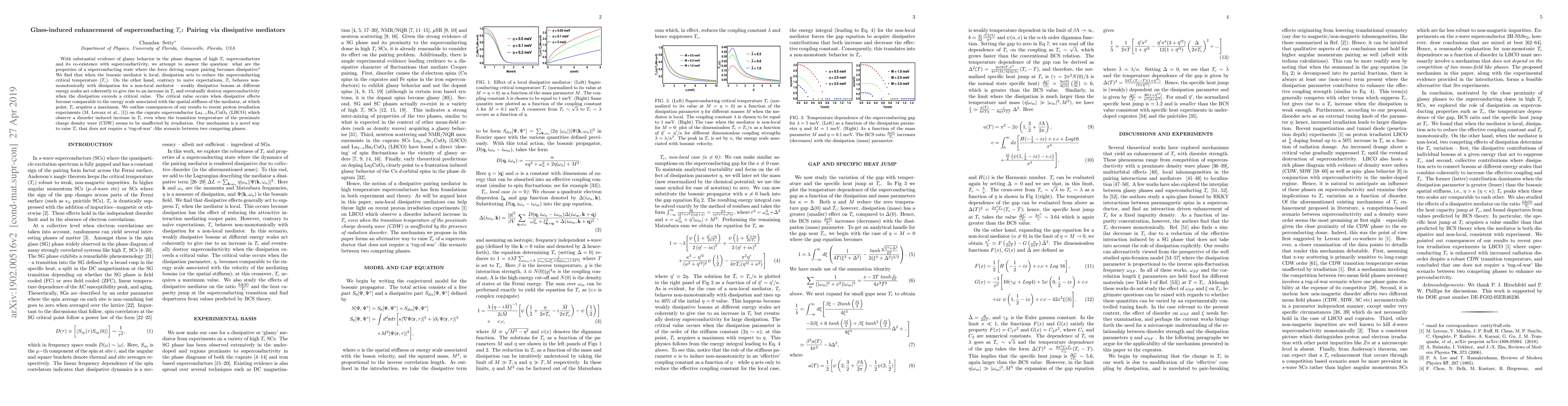 With substantial evidence of glassy behavior in the phase diagram of high $T_c$ superconductors and its co-existence with superconductivity, we attempt to answer the question: what are the properties of a superconducting state where the force driving cooper pairing becomes dissipative? We find that when the bosonic mediator is local, dissipation acts to reduce the superconducting critical temperature ($T_c$). On the other hand, contrary to na\"{i}ve expectations, $T_c$ behaves non-monotonically with dissipation for a non-local mediator -- weakly dissipative bosons at different energy scales act coherently to give rise to an increase in $T_c$ and eventually destroy superconductivity when the dissipation exceeds a critical value. The critical value occurs when dissipative effects become comparable to the energy scale associated with the spatial stiffness of the mediator, at which point, $T_c$ acquires a maximum. We outline consequences of our results to recent proton irradiation experiments (M. Leroux et al.,~\cite{Welp2018}) on the cuprate superconductor La$_{2-x}$Ba$_x$CuO$_4$ (LBCO) which observe a disorder induced increase in $T_c$ even when the transition temperature of the proximate charge density wave (CDW) is unaffected by the presence of irradiation. Our mechanism is a novel way to raise $T_c$ that does not require a `tug-of-war' -type scenario between two competing phases.