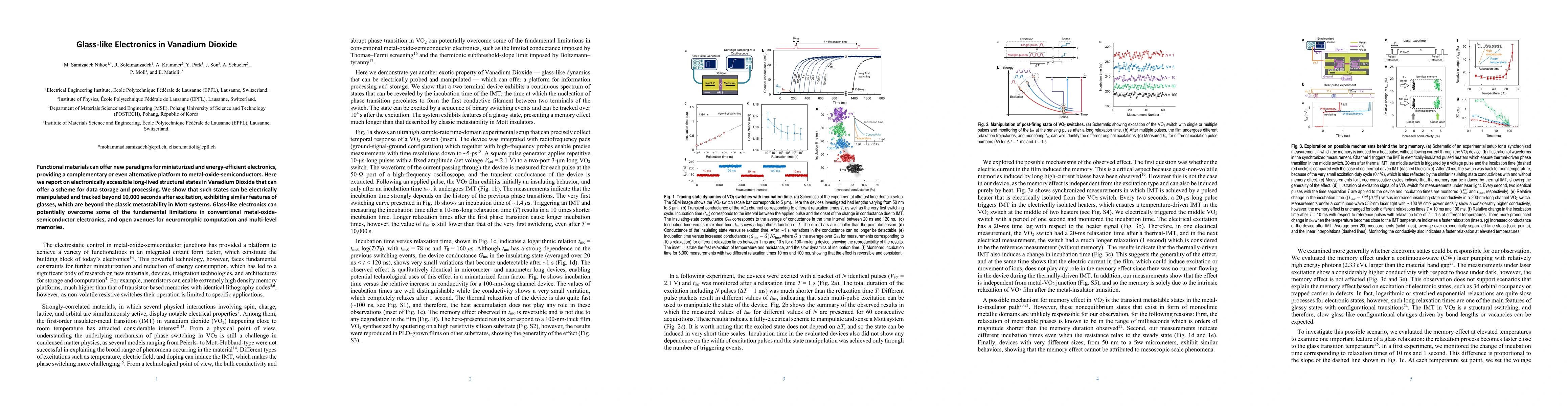Functional materials can offer new paradigms for miniaturized and energy-efficient electronics, providing a complementary or even alternative platform to metal-oxide-semiconductors. Here we report on electronically accessible long-lived structural states in Vanadium Dioxide that can offer a scheme for data storage and processing. We show that such states can be electrically manipulated and tracked beyond 10,000 seconds after excitation, exhibiting similar features of glasses, which are beyond the classic metastability in Mott systems. Glass-like electronics can potentially overcome some of the fundamental limitations in conventional metal-oxide-semiconductor electronics, and open avenues for neuromorphic computation and multi-level memories.