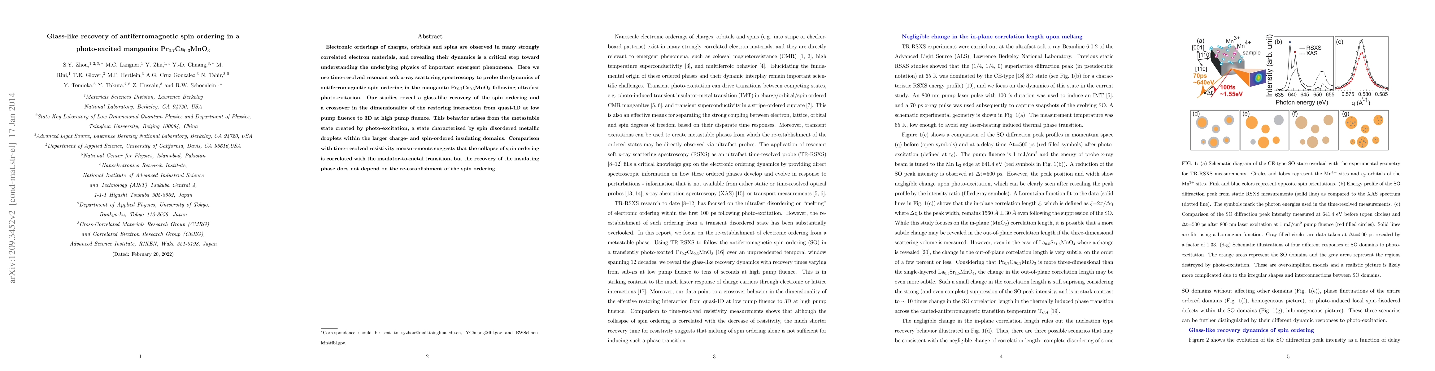 Electronic orderings of charges, orbitals and spins are observed in many strongly correlated electron materials, and revealing their dynamics is a critical step toward understanding the underlying physics of important emergent phenomena. Here we use time-resolved resonant soft x-ray scattering spectroscopy to probe the dynamics of antiferromagnetic spin ordering in the manganite Pr$_{0.7}$Ca$_{0.3}$MnO$_3$ following ultrafast photo-exitation. Our studies reveal a glass-like recovery of the spin ordering and a crossover in the dimensionality of the restoring interaction from quasi-1D at low pump fluence to 3D at high pump fluence. This behavior arises from the metastable state created by photo-excitation, a state characterized by spin disordered metallic droplets within the larger charge- and spin-ordered insulating domains. Comparison with time-resolved resistivity measurements suggests that the collapse of spin ordering is correlated with the insulator-to-metal transition, but the recovery of the insulating phase does not depend on the re-establishment of the spin ordering.