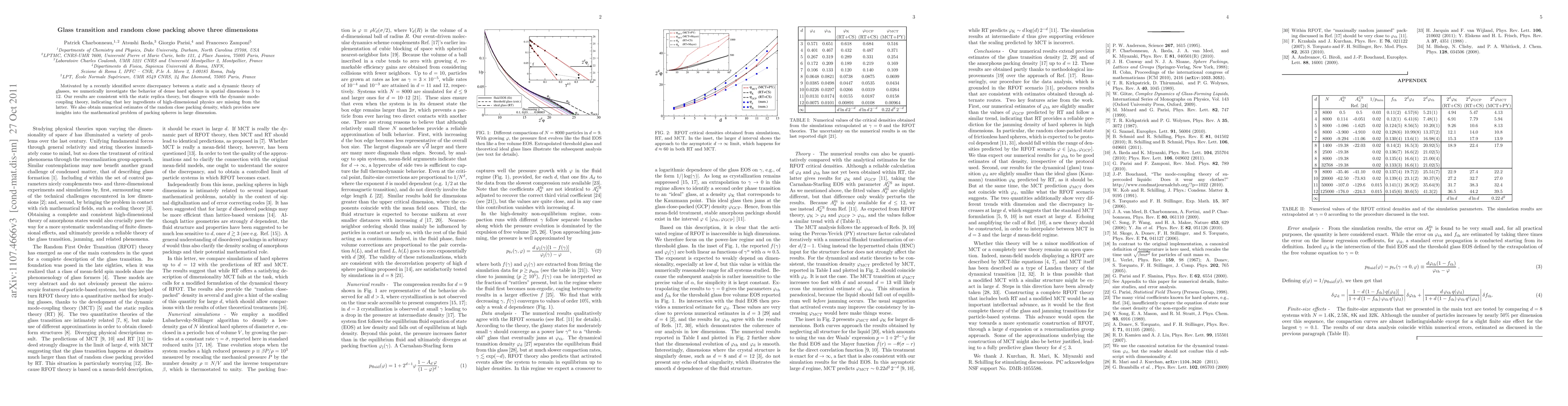 Motivated by a recently identified severe discrepancy between a static and a dynamic theory of glasses, we numerically investigate the behavior of dense hard spheres in spatial dimensions 3 to 12. Our results are consistent with the static replica theory, but disagree with the dynamic mode-coupling theory, indicating that key ingredients of high-dimensional physics are missing from the latter. We also obtain numerical estimates of the random close packing density, which provides new insights into the mathematical problem of packing spheres in large dimension.