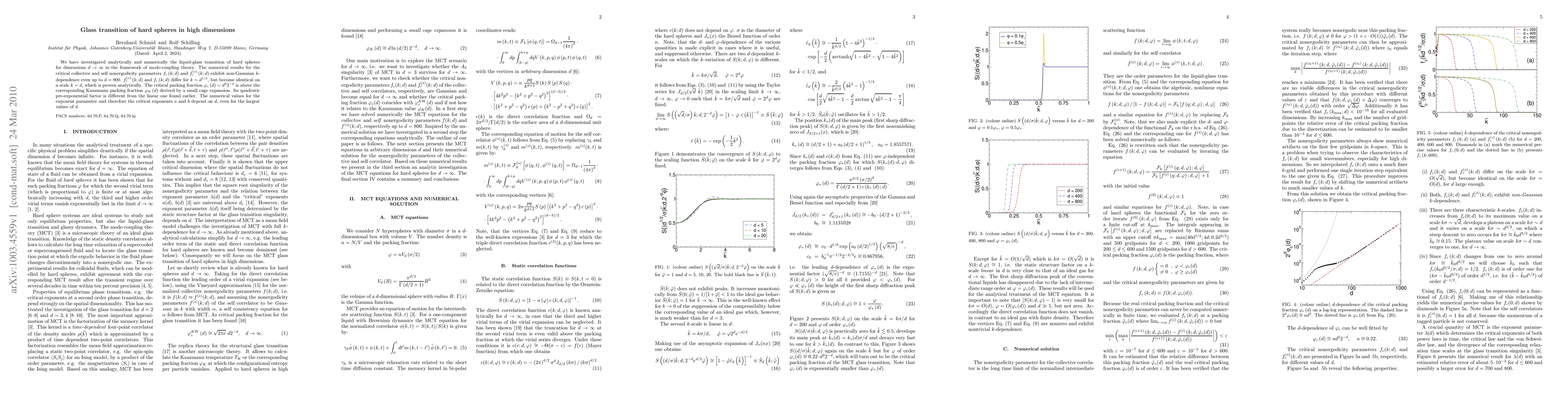 Researchers studied the glass transition of hard spheres in high dimensions using mode-coupling theory, finding that critical collective and self-nonergodicity parameters exhibit non-Gaussian k-dependence even at d=800.