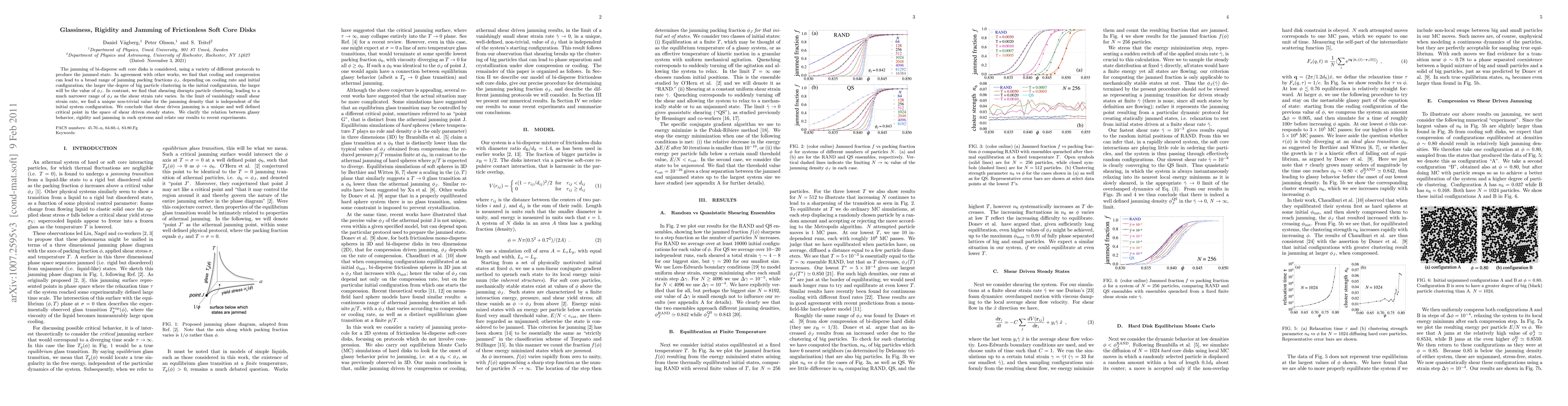 Researchers studied how soft core disks jam under different conditions, finding that shearing disrupts particle clustering and leads to a unique critical point in the system's behavior, while cooling and compression result in varying degrees of jamming depending on initial configuration.