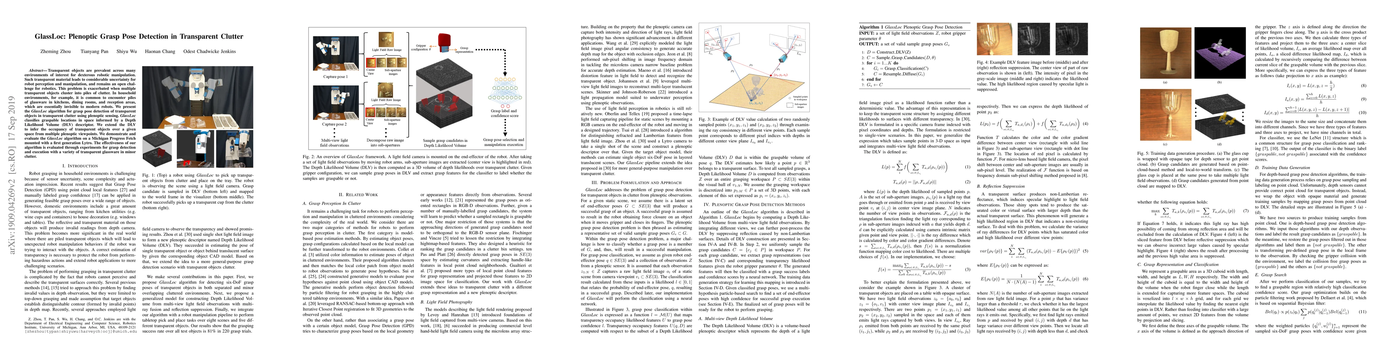 GlassLoc is a novel algorithm for detecting graspable poses of transparent objects in cluttered environments using plenoptic sensing. It leverages a Depth Likelihood Volume descriptor to infer object occupancy from multiple viewpoints, enabling effective grasp detection and execution in scenarios with transparent glassware.