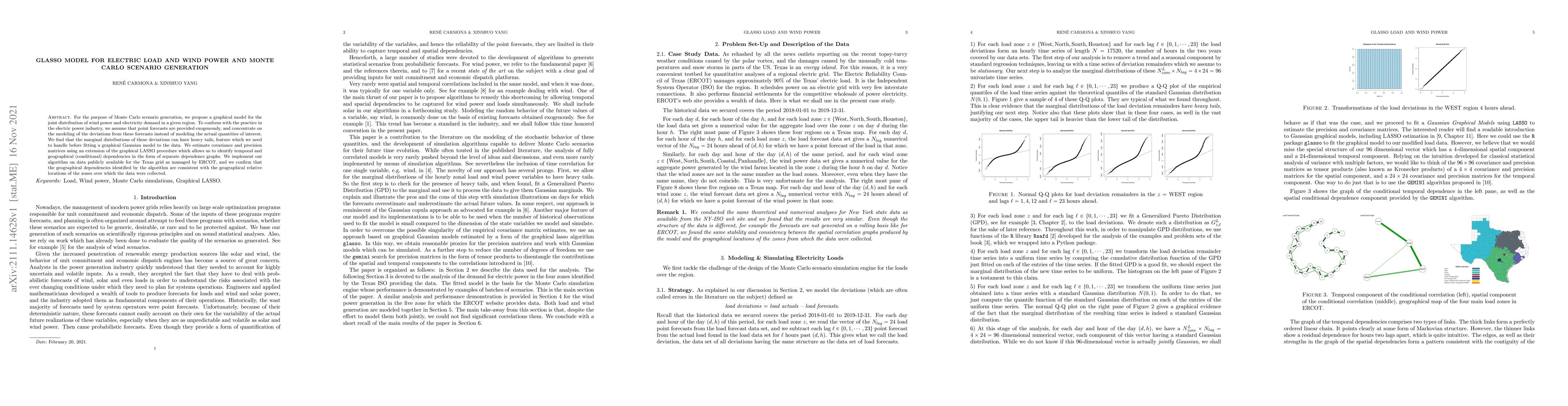 For the purpose of Monte Carlo scenario generation, we propose a graphical model for the joint distribution of wind power and electricity demand in a given region. To conform with the practice in the electric power industry, we assume that point forecasts are provided exogenously, and concentrate on the modeling of the deviations from these forecasts instead of modeling the actual quantities of interest. We find that the marginal distributions of these deviations can have heavy tails, feature which we need to handle before fitting a graphical Gaussian model to the data. We estimate covariance and precision matrices using an extension of the graphical LASSO procedure which allows us to identify temporal and geographical (conditional) dependencies in the form of separate dependence graphs. We implement our algorithm on data publicly available for the Texas grid as managed by ERCOT, and we confirm that the geographical dependencies identified by the algorithm are consistent with the geographical relative locations of the zones over which the data were collected.