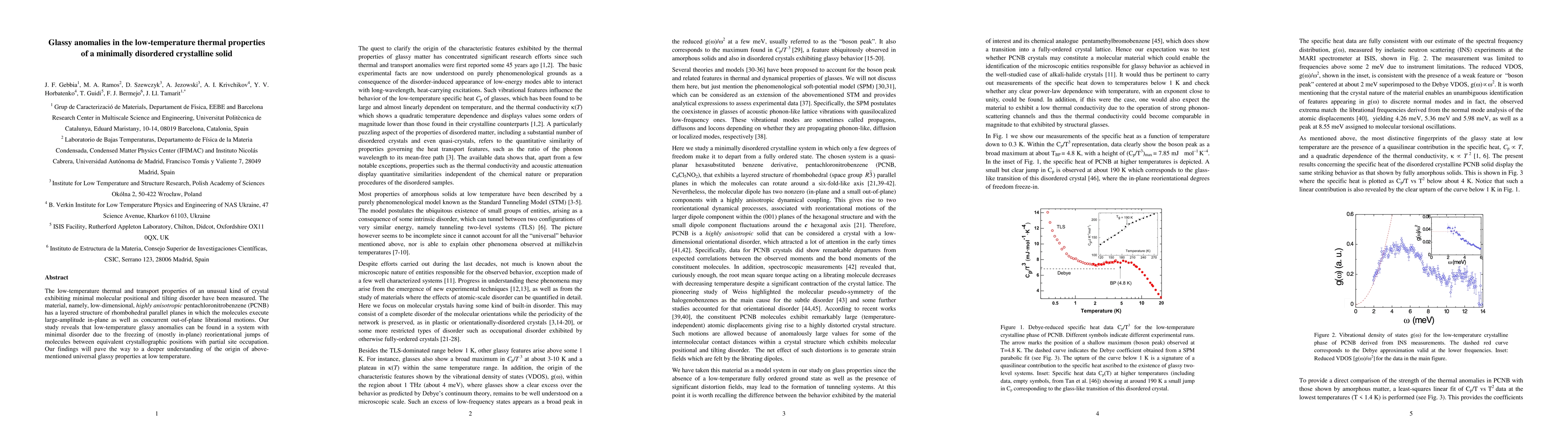 This study investigates the low-temperature thermal properties of a highly anisotropic, minimally disordered crystalline solid, pentachloronitrobenzene (PCNB), revealing glassy anomalies due to the freezing of molecular reorientational jumps. These findings suggest that universal glassy behaviors can emerge even in systems with minimal disorder.