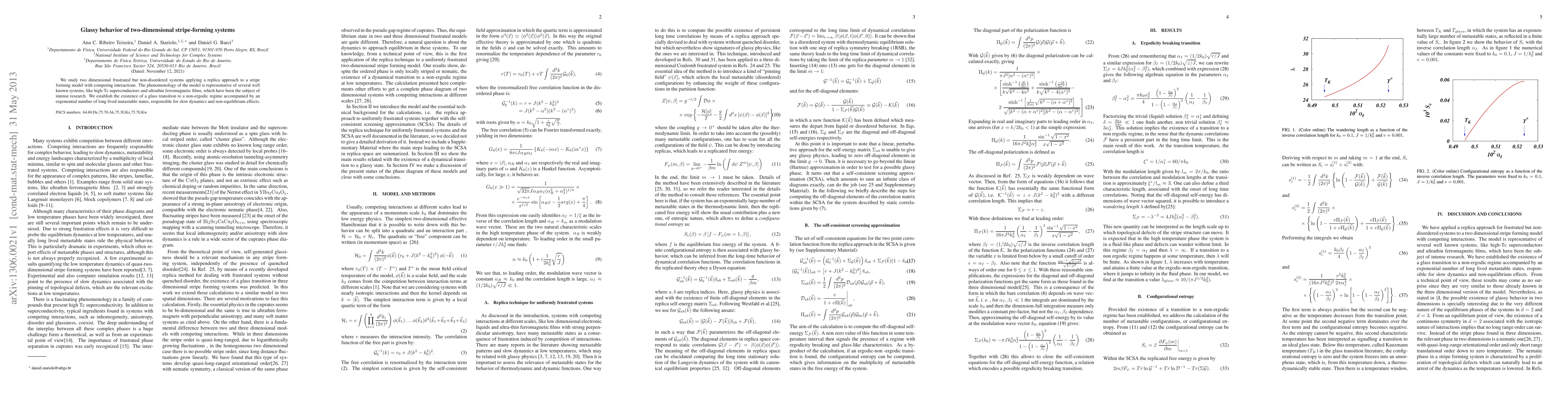 This paper investigates two-dimensional frustrated systems using a replica approach to model stripe formations, revealing a glass transition to a non-ergodic regime with numerous long-lived metastable states, akin to phenomena observed in high-Tc superconductors and ultrathin ferromagnetic films. The findings highlight slow dynamics and non-equilibrium effects in these systems.