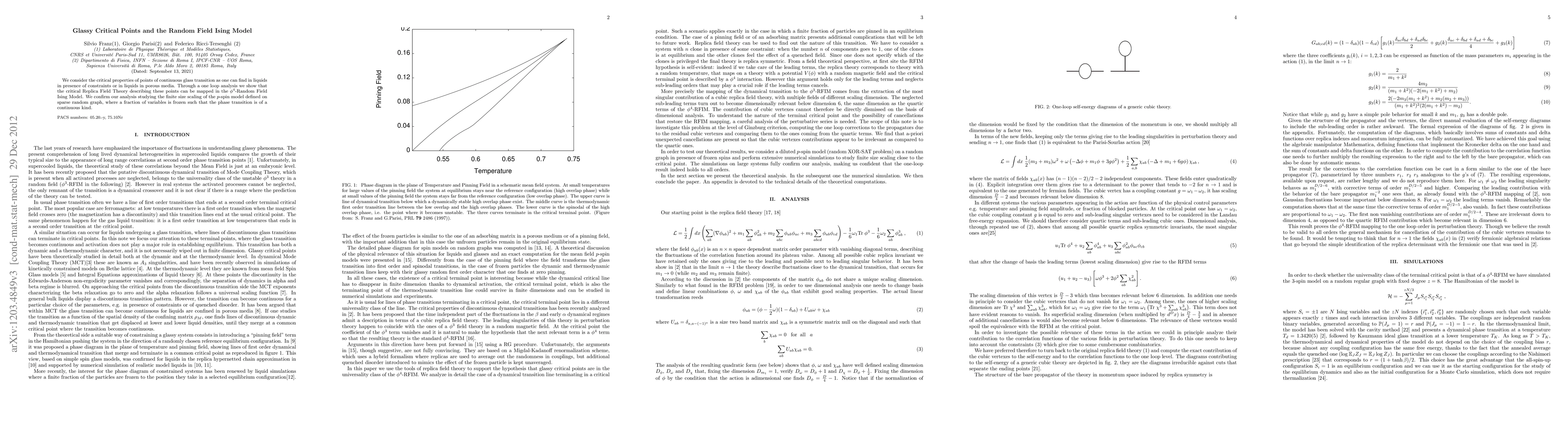 This paper explores the critical behavior of glassy transitions in constrained liquids using Replica Field Theory, demonstrating its equivalence to the $\phi^4$-Random Field Ising Model through one loop analysis. The study validates this mapping by examining the finite size scaling of a $p$-spin model on sparse random graphs with frozen variables.