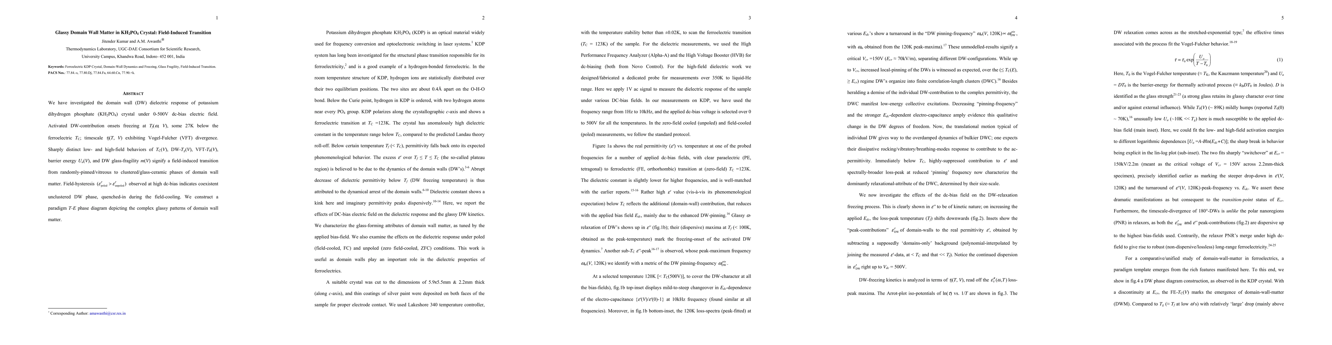 We have investigated the domain wall (DW) dielectric response of potassium dihydrogen phosphate (KH2PO4) crystal under 0-500V dc-bias electric field. Activated DW-contribution onsets freezing at Tf({\omega}, V), some 27K below the ferroelectric TC; timescale {\tau}f(T, V) exhibiting Vogel-Fulcher (VFT) divergence. Sharply distinct low- and high-field behaviors of TC(V), DW-Tg(V), VFT-T0(V), barrier energy Ua(V), and DW glass-fragility m(V) signify a field-induced transition from randomly-pinned/vitreous to clustered/glass-ceramic phases of domain wall matter. Field-hysteresis ({\epsilon}'poled > {\epsilon}'unpoled) observed at high dc-bias indicates coexistent unclustered DW phase, quenched-in during the field-cooling. We construct a paradigm T-E phase diagram depicting the complex glassy patterns of domain wall matter.