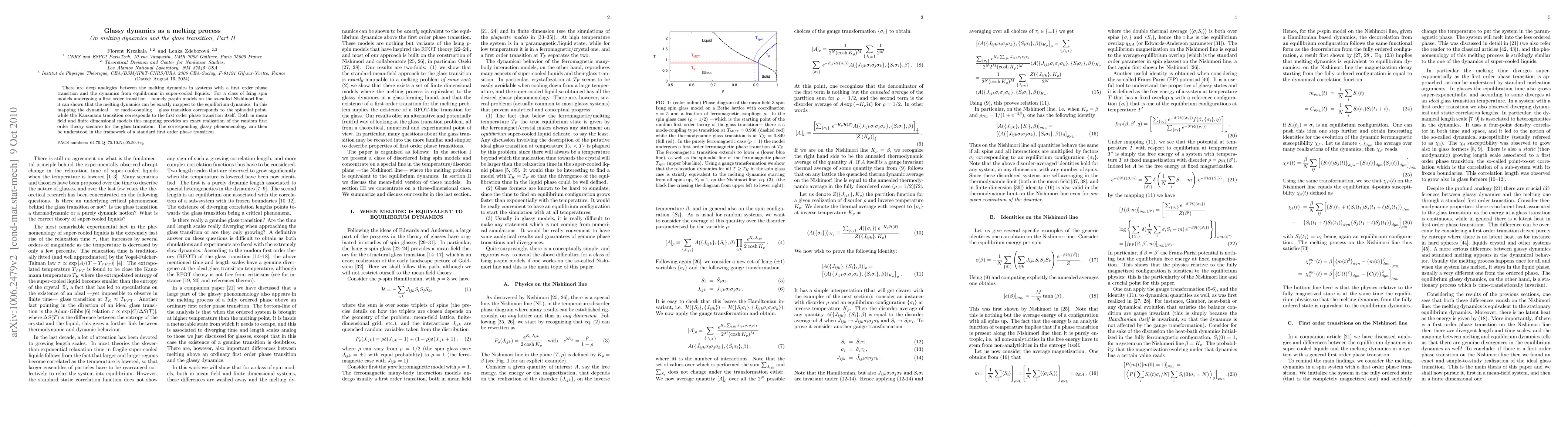 There are deep analogies between the melting dynamics in systems with a first order phase transition and the dynamics from equilibrium in super-cooled liquids. For a class of Ising spin models undergoing a first order transition - namely p-spin models on the so-called Nishimori line - it can be shown that the melting dynamics can be exactly mapped to the equilibrium dynamics. In this mapping the dynamical -or mode-coupling- glass transition corresponds to the spinodal point, while the Kauzmann transition corresponds to the first order phase transition itself. Both in mean field and finite dimensional models this mapping provides an exact realization of the random first order theory scenario for the glass transition. The corresponding glassy phenomenology can then be understood in the framework of a standard first order phase transition.