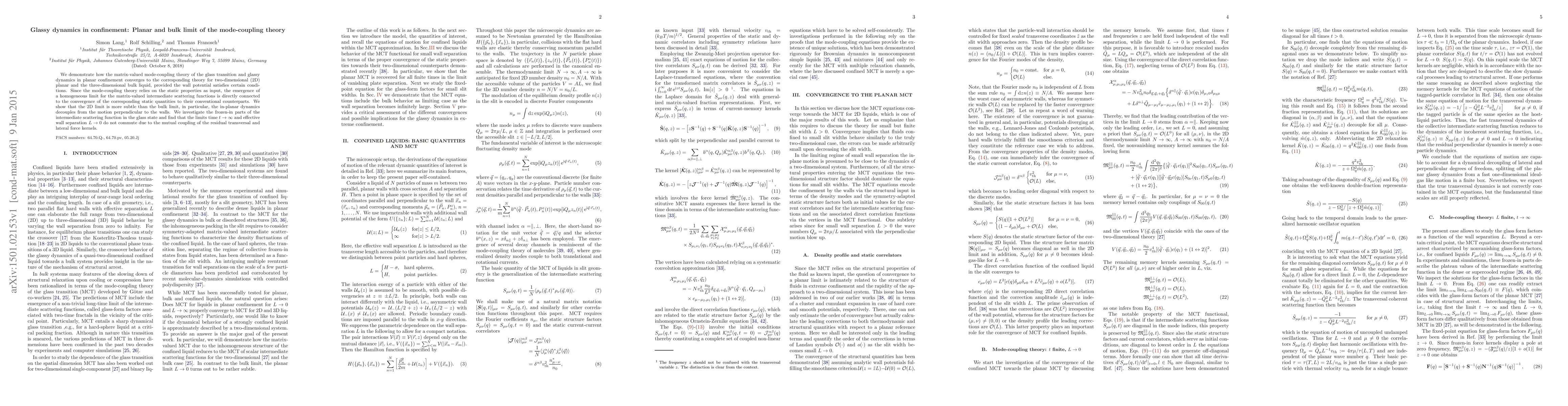 We demonstrate how the matrix-valued mode-coupling theory of the glass transition and glassy dynamics in planar confinement converges to the corresponding theory for two-dimensional (2D) planar and the three-dimensional bulk liquid, provided the wall potential satisfies certain conditions. Since the mode-coupling theory relies on the static properties as input, the emergence of a homogeneous limit for the matrix-valued intermediate scattering functions is directly connected to the convergence of the corresponding static quantities to their conventional counterparts. We show that the 2D limit is more subtle than the bulk limit, in particular, the in-planar dynamics decouples from the motion perpendicular to the walls. We investigate the frozen-in parts of the intermediate scattering function in the glass state and find that the limits time $t\to \infty$ and effective wall separation $L\to 0$ do not commute due to the mutual coupling of the residual transversal and lateral force kernels.