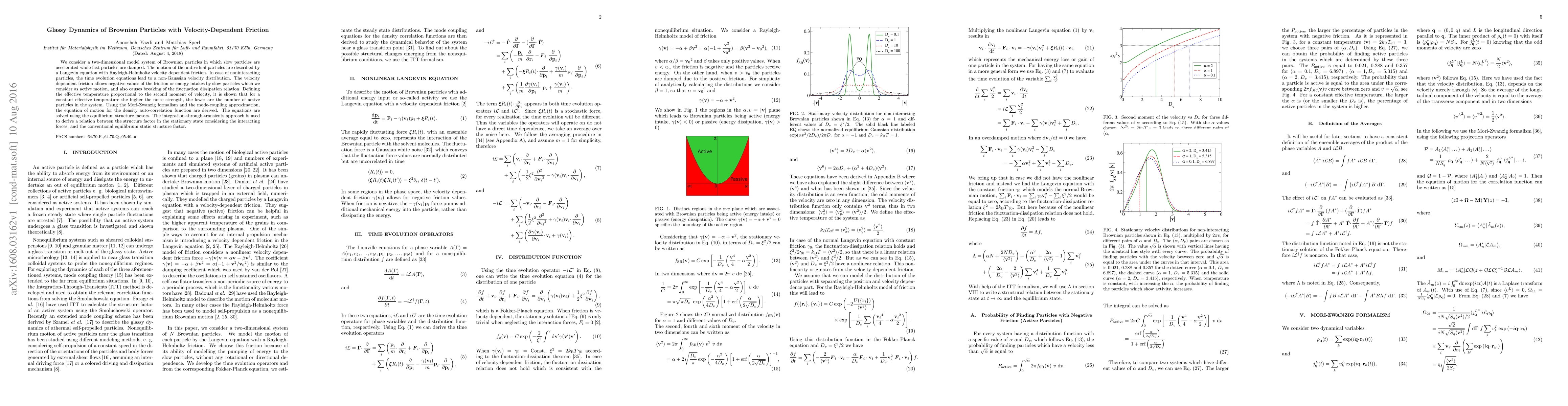 We consider a two-dimensional model system of Brownian particles in which slow particles are accelerated while fast particles are damped. The motion of the individual particles are described by a Langevin equation with Rayleigh-Helmholtz velocity dependent friction. In case of noninteracting particles, the time evolution equations lead to a non-Gaussian velocity distribution. The velocity dependent friction allows negative values of the friction or energy intakes by slow particles which we consider as active motion, and also causes breaking of the fluctuation dissipation relation. Defining the effective temperature proportional to the second moment of velocity, it is shown that for a constant effective temperature the higher the noise strength, the lower are the number of active particles in the system. Using the Mori-Zwanzig formalism and the mode-coupling approximation, the equation of motion for the density auto-correlation function are derived. The equations are solved using the equilibrium structure factors. The integration-through-transients approach is used to derive a relation between the structure factor in the stationary state considering the interacting forces, and the conventional equilibrium static structure factor.