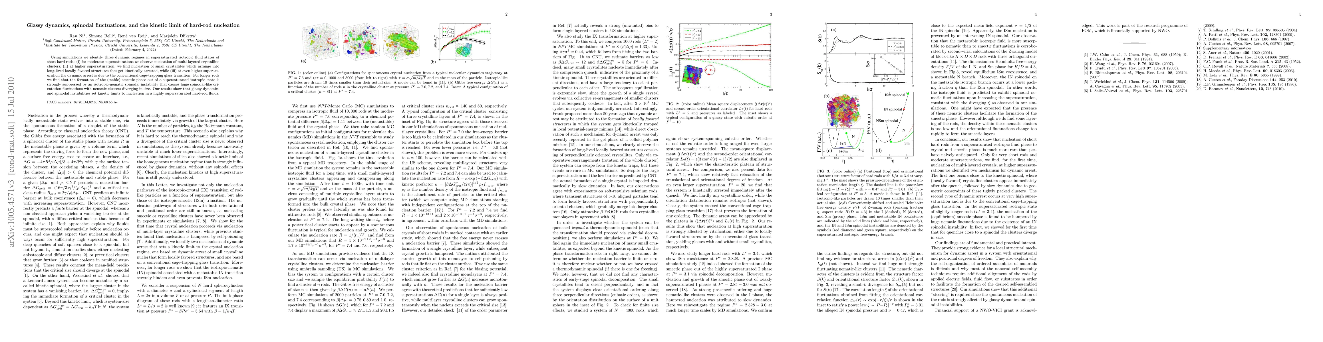 This research identifies three dynamic regimes in supersaturated hard-rod fluids, revealing the nucleation of crystalline clusters and kinetically arrested structures, and the glassy dynamics due to cage-trapping at high supersaturations. It also highlights the suppression of smectic phase formation by spinodal instabilities, leading to significant orientation fluctuations.
