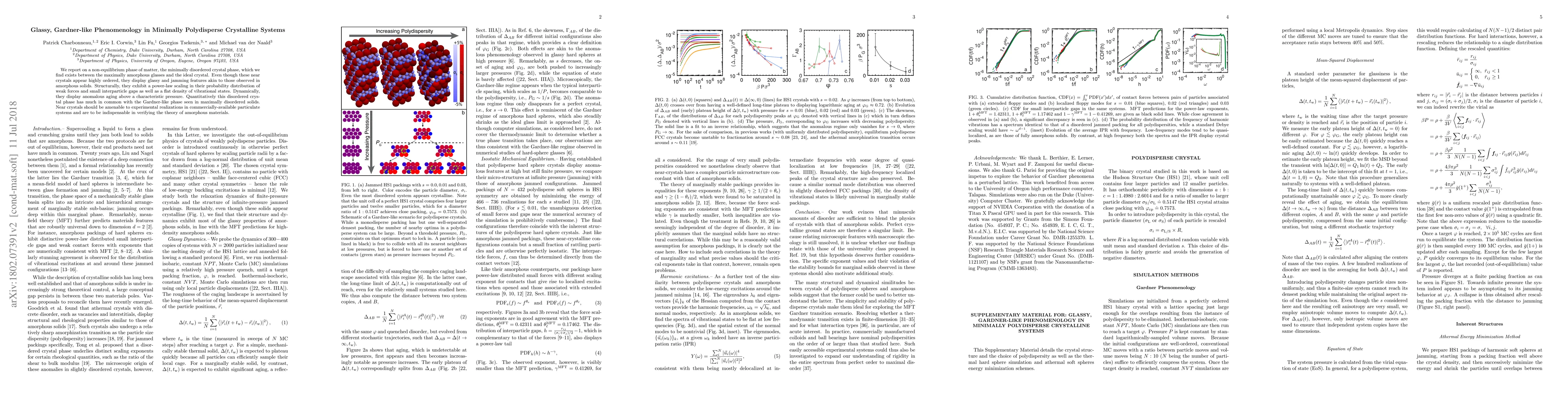 We report on a non-equilibrium phase of matter, the minimally disordered crystal phase, which we find exists between the maximally amorphous glasses and the ideal crystal. Even though these near crystals appear highly ordered, they display glassy and jamming features akin to those observed in amorphous solids. Structurally, they exhibit a power-law scaling in their probability distribution of weak forces and small interparticle gaps as well as a flat density of vibrational states. Dynamically, they display anomalous aging above a characteristic pressure. Quantitatively this disordered crystal phase has much in common with the Gardner-like phase seen in maximally disordered solids. Near crystals should be amenable to experimental realizations in commercially-available particulate systems and are to be indispensable in verifying the theory of amorphous materials.