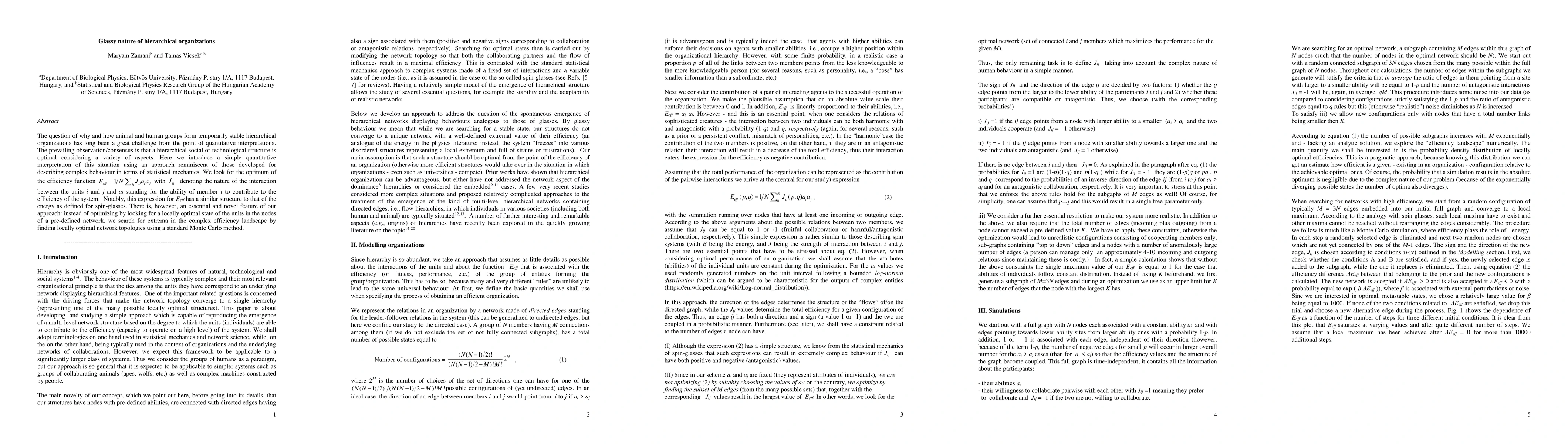 The question of why and how animal and human groups form temporarily stable hierarchical organizations has long been a great challenge from the point of quantitative interpretations. The prevailing observation/consensus is that a hierarchical social or technological structure is optimal considering a variety of aspects. Here we introduce a simple quantitative interpretation of this situation using an approach reminiscent of those developed for describing complex behaviour in terms of statistical mechanics. We look for the optimum of the efficiency function $E_{\rm eff}=1/N \sum_{i,j} J_{ij} a_i a_j$ with $J_{ij}$ denoting the nature of the interaction between the units $i$ and $j$ and $a_i$ standing for the ability of member $i$ to contribute to the efficiency of the system. Notably, this expression for $E_{\rm eff}$ has a similar structure to that of the energy as defined for spin-glasses. There is, however, an essential and novel feature of our approach: instead of optimizing by looking for a locally optimal state of the units in the nodes of a pre-defined network, we search for extrema in the complex efficiency landscape by finding locally optimal network topologies using a standard Monte Carlo method.
