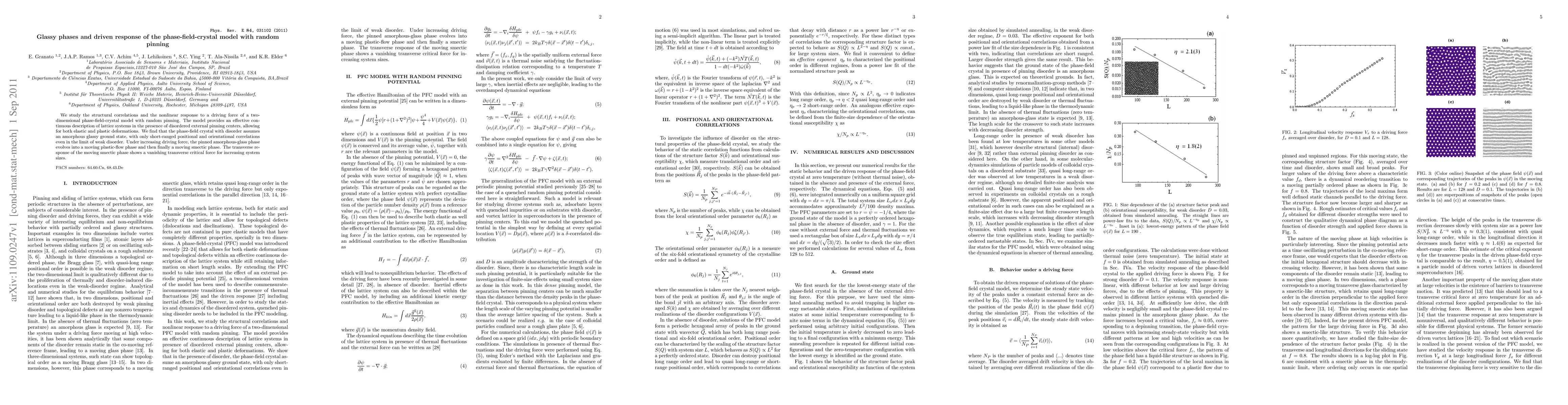 We study the structural correlations and the nonlinear response to a driving force of a two-dimensional phase-field-crystal model with random pinning. The model provides an effective continuous description of lattice systems in the presence of disordered external pinning centers, allowing for both elastic and plastic deformations. We find that the phase-field crystal with disorder assumes an amorphous glassy ground state, with only short-ranged positional and orientational correlations even in the limit of weak disorder. Under increasing driving force, the pinned amorphous-glass phase evolves into a moving plastic-flow phase and then finally a moving smectic phase. The transverse response of the moving smectic phase shows a vanishing transverse critical force for increasing system sizes.