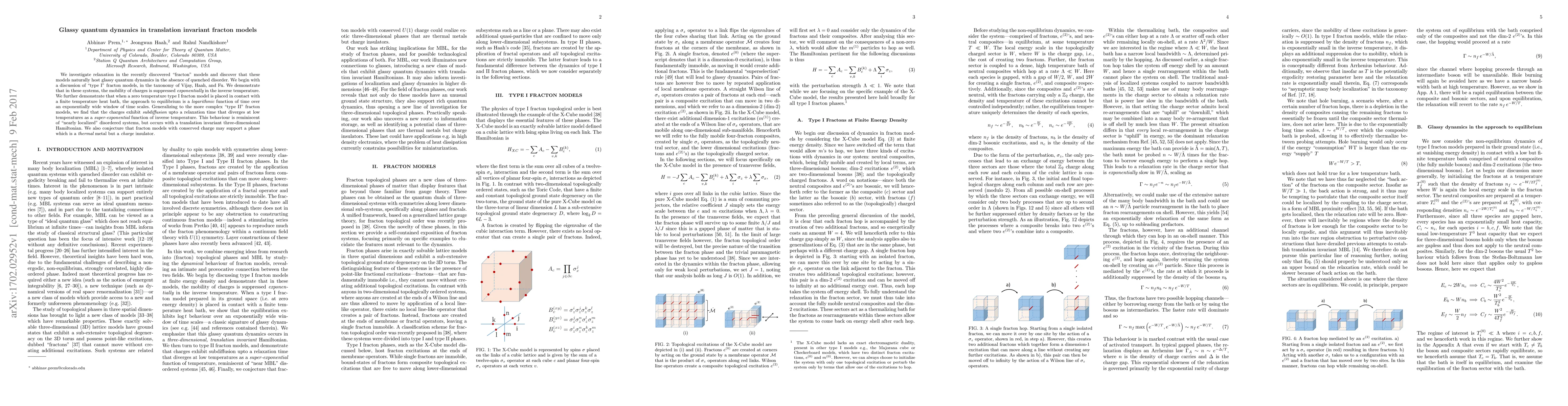We investigate relaxation in the recently discovered "fracton" models and discover that these models naturally host glassy quantum dynamics in the absence of quenched disorder. We begin with a discussion of "type I" fracton models, in the taxonomy of Vijay, Haah, and Fu. We demonstrate that in these systems, the mobility of charges is suppressed exponentially in the inverse temperature. We further demonstrate that when a zero temperature type I fracton model is placed in contact with a finite temperature heat bath, the approach to equilibrium is a logarithmic function of time over an exponentially wide window of time scales. Generalizing to the more complex "type II" fracton models, we find that the charges exhibit subdiffusion upto a relaxation time that diverges at low temperatures as a super-exponential function of inverse temperature. This behaviour is reminiscent of "nearly localized" disordered systems, but occurs with a translation invariant three-dimensional Hamiltonian. We also conjecture that fracton models with conserved charge may support a phase which is a thermal metal but a charge insulator.