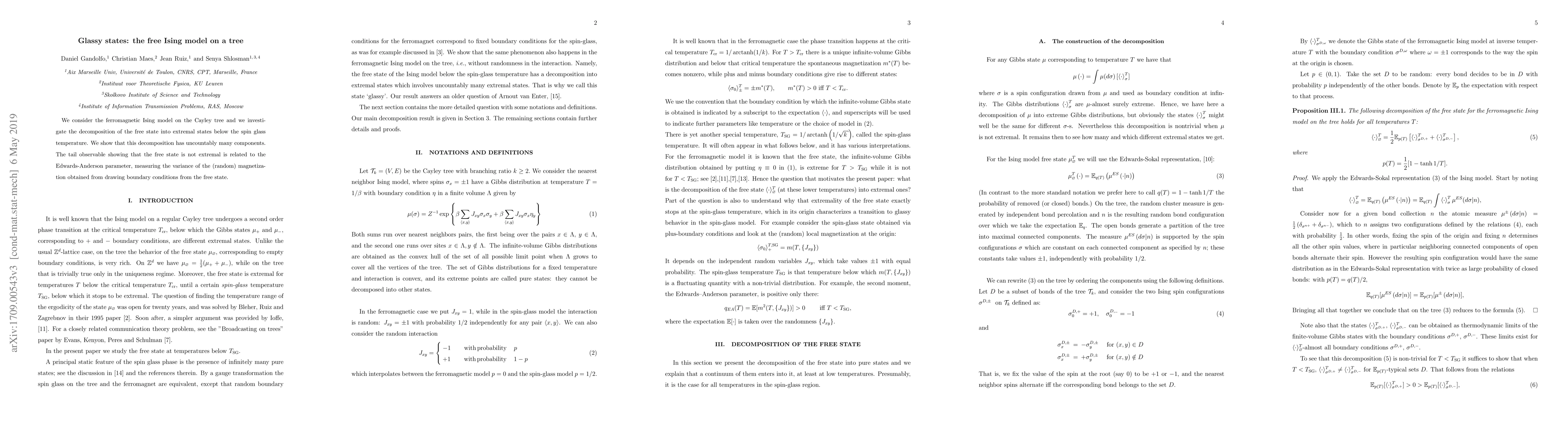 This paper examines the ferromagnetic Ising model on a Cayley tree, revealing that the free state decomposes into uncountably many extremal states below the spin glass temperature. The non-extremality of the free state is linked to the Edwards-Anderson parameter, which measures the variance in magnetization derived from random boundary conditions.