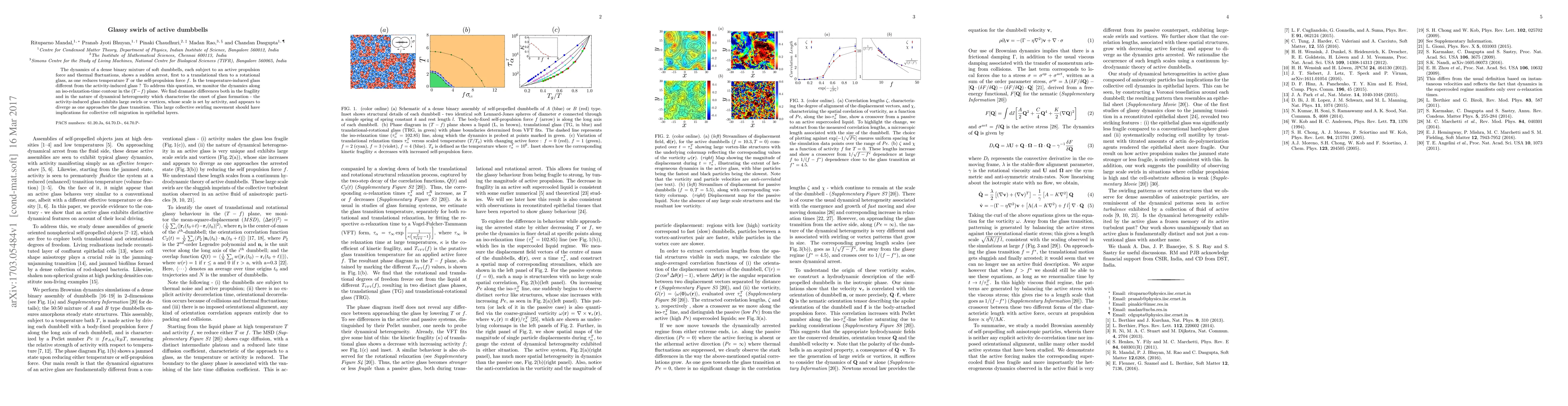 This study investigates the dynamics of a dense binary mixture of active dumbbells, revealing distinct glassy states induced by temperature and activity. The temperature-induced glass differs significantly from the activity-induced glass, which exhibits large swirling vortices whose scale depends on activity, potentially impacting collective cell migration in epithelial layers.