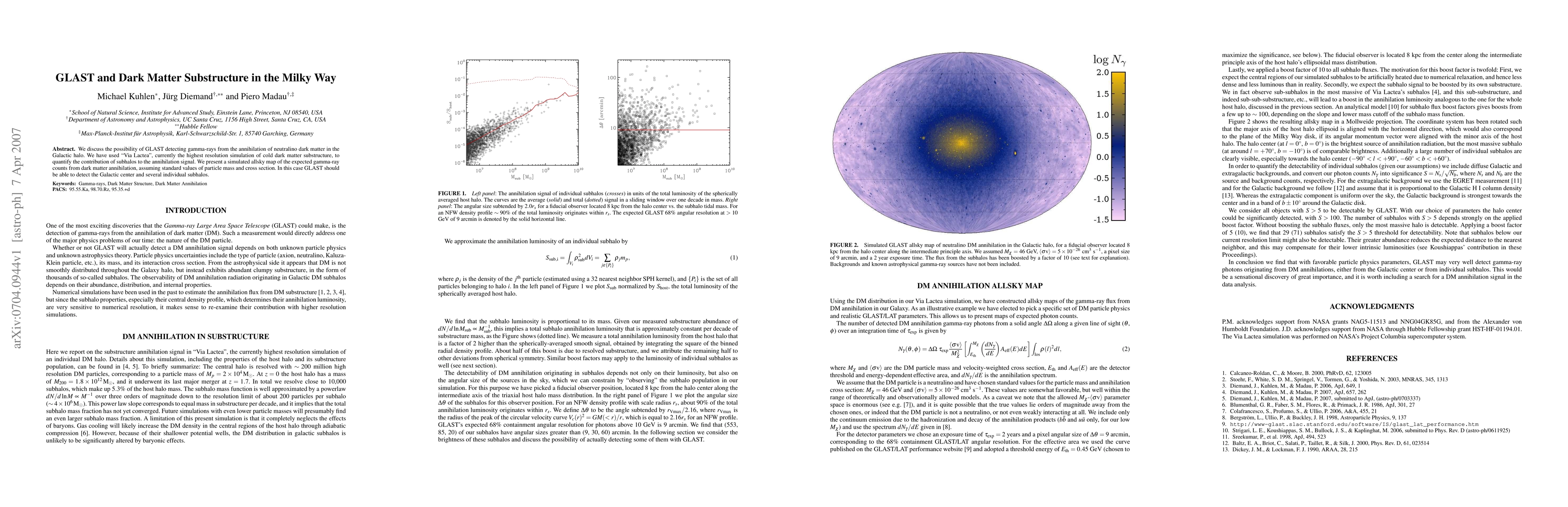 This paper explores the potential for GLAST to detect gamma-rays from neutralino dark matter annihilation in the Milky Way's Galactic halo, using the "Via Lactea" simulation to model dark matter substructure. It concludes that GLAST could detect signals from the Galactic center and several subhalos.