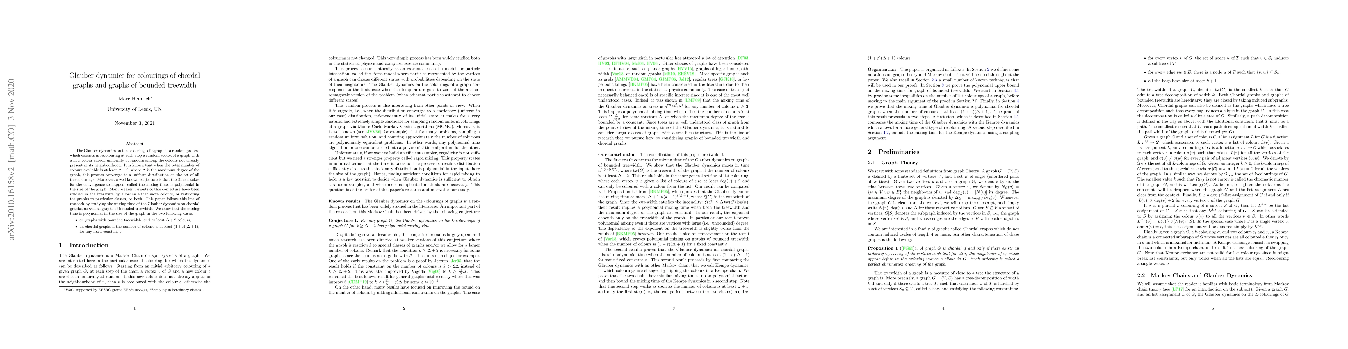 This paper investigates the mixing time of the Glauber dynamics for colourings on chordal graphs and graphs with bounded treewidth. It proves that the mixing time is polynomial when the number of colours exceeds certain bounds, specifically $\Delta +2$ for bounded treewidth graphs and $(1+\varepsilon)(\Delta +1)$ for chordal graphs.