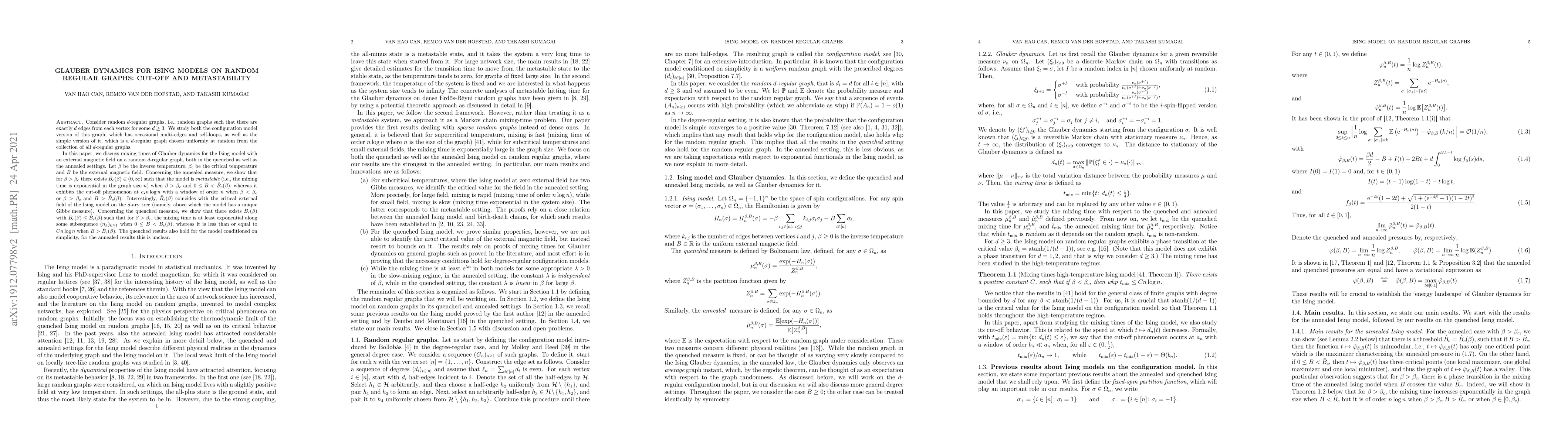 This paper investigates the mixing times of Glauber dynamics for the Ising model on random $d$-regular graphs, highlighting metastability and cut-off phenomena. It shows that for $\beta > \beta_c$ and small external magnetic fields, the model is metastable; for larger fields, it exhibits a cut-off phenomenon at $c_\star n \log n$. The critical external field $\hat{B}_c(\beta)$ corresponds to the critical field for uniqueness of the Gibbs measure on the $d$-ary tree.