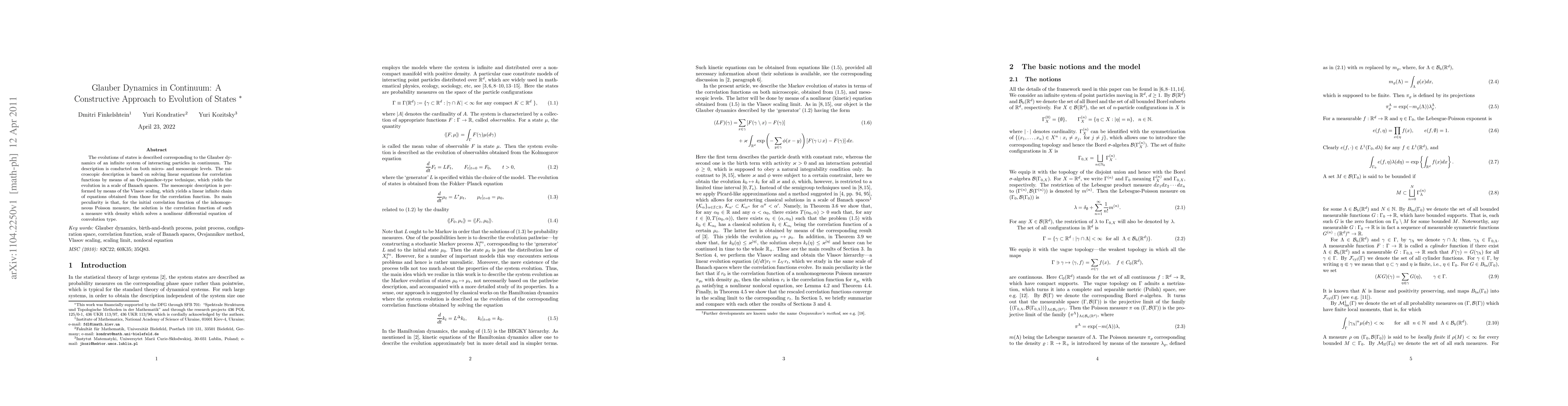This paper presents a constructive approach to the evolution of states in the Glauber dynamics for an infinite system of interacting particles in continuum. It utilizes an Ovsjannikov-type technique for micro-level analysis and the Vlasov scaling for mesoscopic analysis, revealing a nonlinear differential equation for the initial correlation function of an inhomogeneous Poisson measure.
