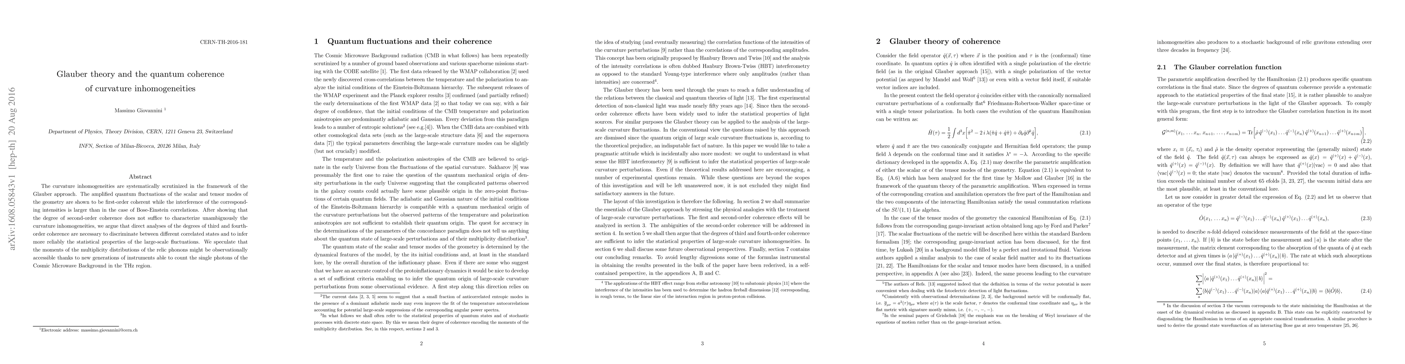 The curvature inhomogeneities are systematically scrutinized in the framework of the Glauber approach. The amplified quantum fluctuations of the scalar and tensor modes of the geometry are shown to be first-order coherent while the interference of the corresponding intensities is larger than in the case of Bose-Einstein correlations. After showing that the degree of second-order coherence does not suffice to characterize unambiguously the curvature inhomogeneities, we argue that direct analyses of the degrees of third and fourth-order coherence are necessary to discriminate between different correlated states and to infer more reliably the statistical properties of the large-scale fluctuations. We speculate that the moments of the multiplicity distributions of the relic phonons might be observationally accessible thanks to new generations of instruments able to count the single photons of the Cosmic Microwave Background in the THz region.
