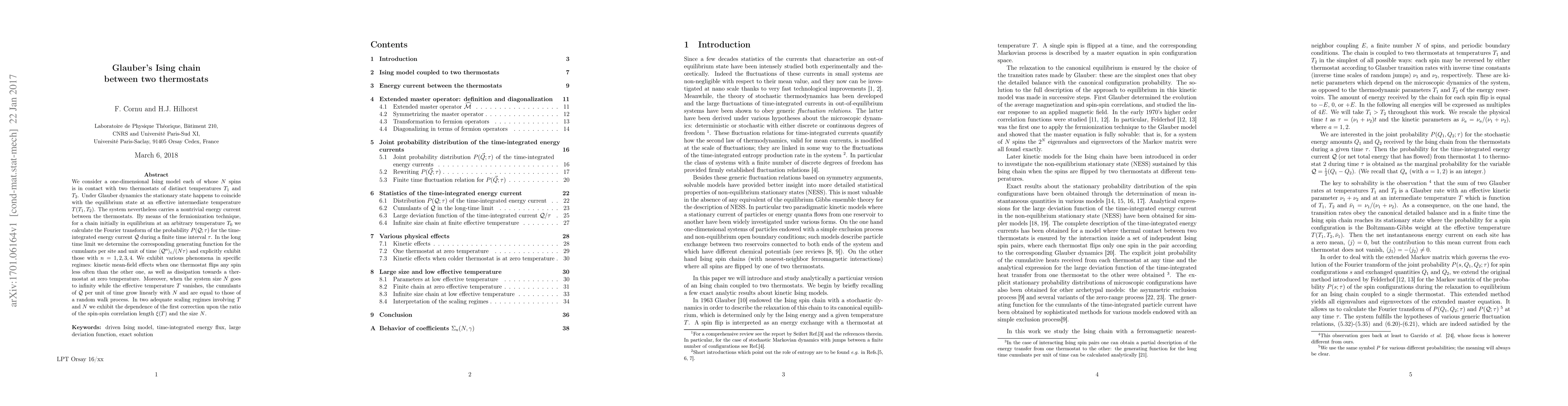 We consider a one-dimensional Ising model each of whose $N$ spins is in contact with two thermostats of distinct temperatures $T_1$ and $T_2$. Under Glauber dynamics the stationary state happens to coincide with the equilibrium state at an effective intermediate temperature $T(T_1,T_2)$. The system nevertheless carries a nontrivial energy current between the thermostats. By means of the fermionization technique, for a chain initially in equilibrium at an arbitrary temperature $T_0$ we calculate the Fourier transform of the probability $P({\cal Q};\tau)$ for the time-integrated energy current ${\cal Q}$ during a finite time interval $\tau$. In the long time limit we determine the corresponding generating function for the cumulants per site and unit of time $\langle{\cal Q}^n\rangle_{\rm c}/(N\tau)$ and explicitly give those with $n=1,2,3,4.$ We exhibit various phenomena in specific regimes: kinetic mean-field effects when one thermostat flips any spin less often than the other one, as well as dissipation towards a thermostat at zero temperature. Moreover, when the system size $N$ goes to infinity while the effective temperature $T$ vanishes, the cumulants of ${\cal Q}$ per unit of time grow linearly with $N$ and are equal to those of a random walk process. In two adequate scaling regimes involving $T$ and $N$ we exhibit the dependence of the first correction upon the ratio of the spin-spin correlation length $\xi(T)$ and the size $N$.