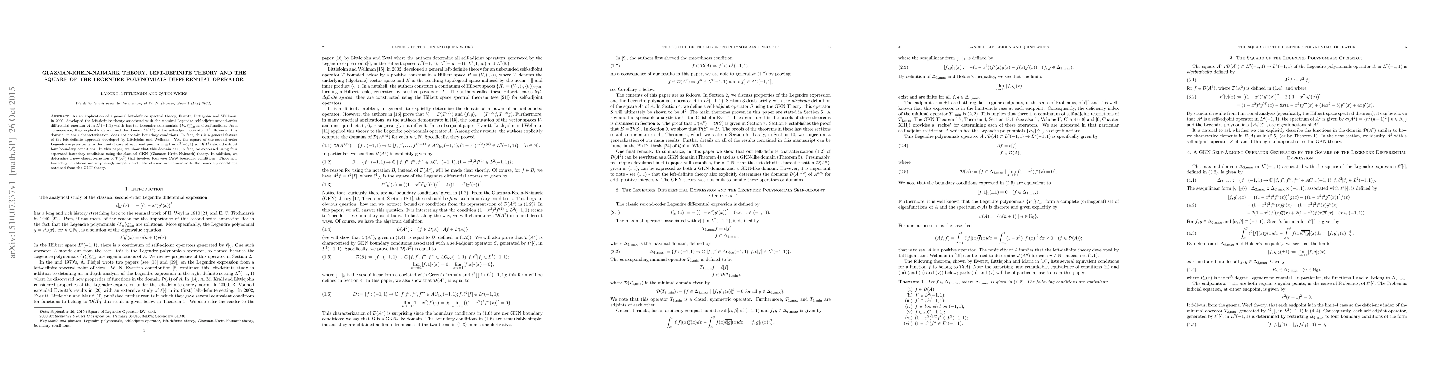 As an application of a general left-definite spectral theory, Everitt, Littlejohn and Wellman, in 2002, developed the left-definite theory associated with the classical Legendre self-adjoint second-order differential operator $A$ in $L^{2}(-1,1)$ which has the Legendre polynomials $\{P_{n}% \}_{n=0}^{\infty}$ as eigenfunctions. As a consequence, they explicitly determined the domain $\mathcal{D}(A^{2})$ of the self-adjoint operator $A^{2}.$ However, this domain, in their characterization, does not contain boundary conditions. In fact, this is a general feature of the left-definite approach developed by Littlejohn and Wellman. Yet, the square of the second-order Legendre expression is in the limit-4 case at each end point $x=\pm1$ in $L^{2}(-1,1)$ so $\mathcal{D}(A^{2})$ should exhibit four boundary conditions. In this paper, we show that this domain can, in fact, be expressed using four separated boundary conditions using the classical GKN (Glazman-Krein-Naimark) theory. In addition, we determine a new characterization of $\mathcal{D}(A^{2})$ that involves four \textit{non-GKN} boundary conditions. These new boundary conditions are surprisingly simple - and natural - and are equivalent to the boundary conditions obtained from the GKN theory.