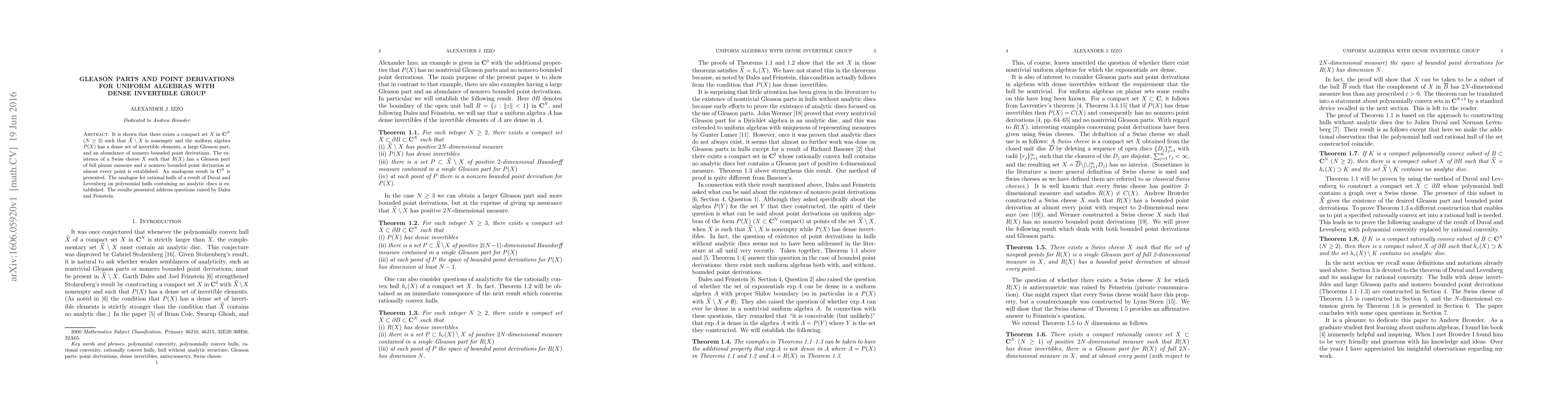 The paper introduces a method for constructing a specific compact set X in CN with desired properties related to uniform algebras, Gleason parts, and point derivations.