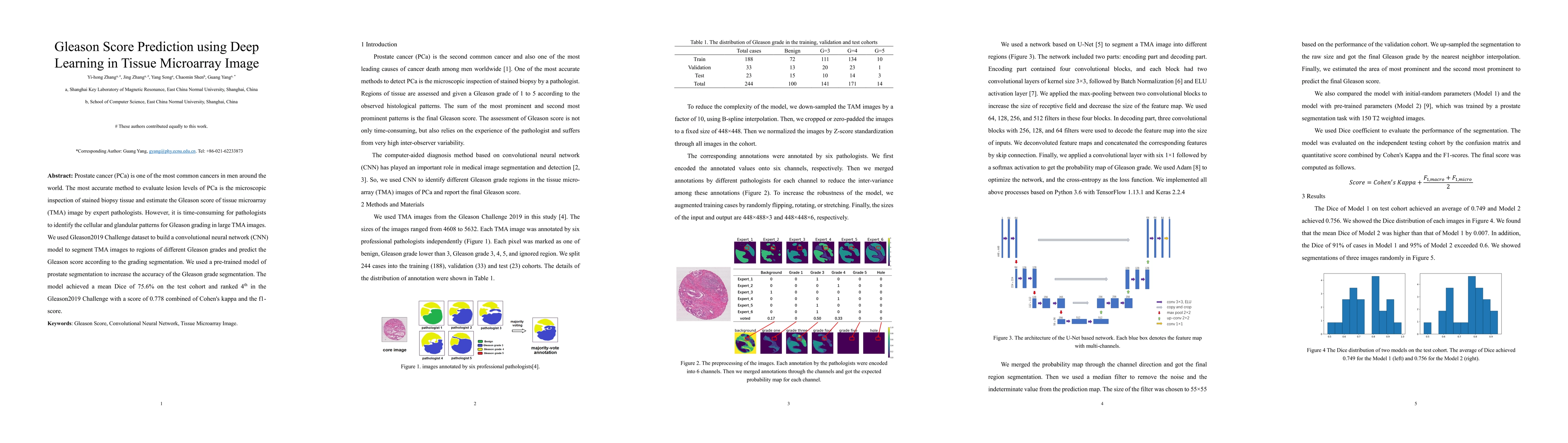 This paper presents a deep learning model using convolutional neural networks (CNN) to predict Gleason scores from tissue microarray images, aiming to automate the time-consuming process of pathologists' microscopic inspection. The model achieved a mean Dice score of 75.6% and ranked 4th in the Gleason2019 Challenge with a combined score of 0.778.