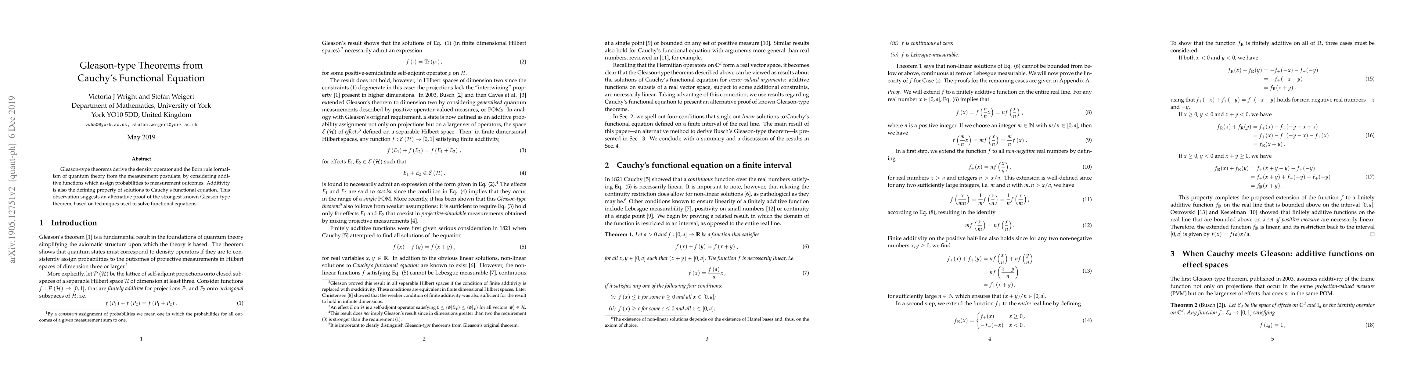 Gleason-type theorems derive the density operator and the Born rule formalism of quantum theory from the measurement postulate, by considering additive functions which assign probabilities to measurement outcomes. Additivity is also the defining property of solutions to Cauchy's functional equation. This observation suggests an alternative proof of the strongest known Gleason-type theorem, based on techniques used to solve functional equations.