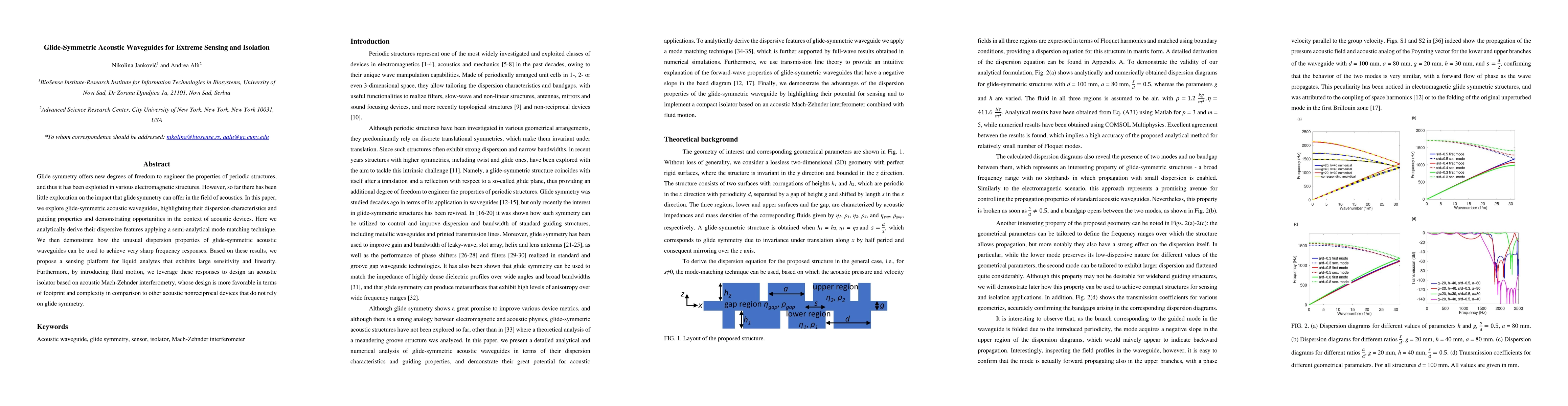 This paper explores glide-symmetric acoustic waveguides, demonstrating their unique dispersion characteristics and sharp frequency responses. It proposes a sensitive sensing platform for liquid analytes and an acoustic isolator with reduced footprint and complexity based on acoustic Mach-Zehnder interferometry.