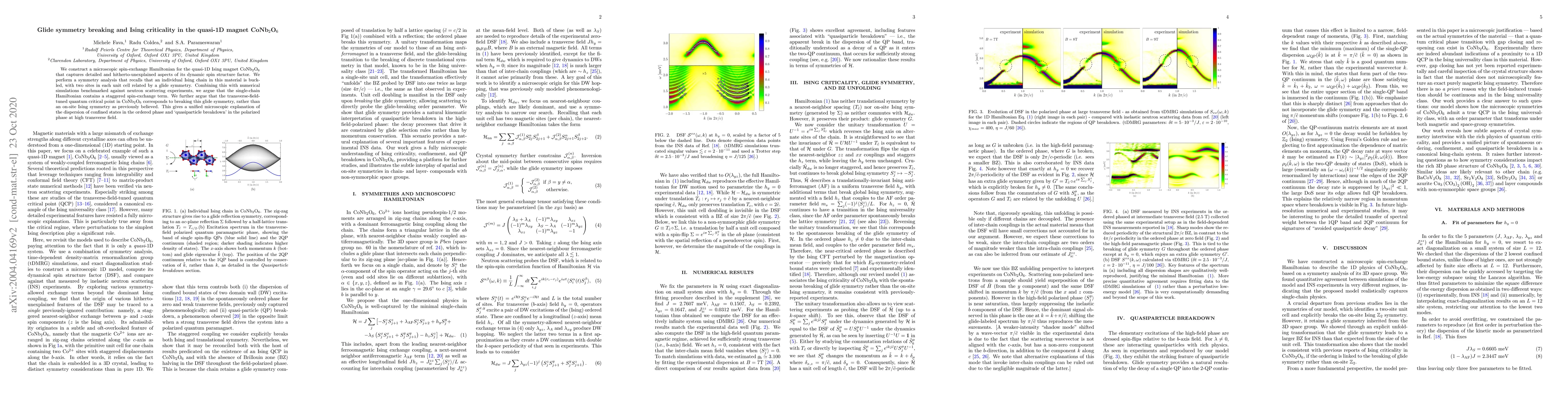 We construct a microscopic spin-exchange Hamiltonian for the quasi-1D Ising magnet CoNb$_2$O$_6$ that captures detailed and hitherto-unexplained aspects of its dynamic spin structure factor. We perform a symmetry analysis that recalls that an individual Ising chain in this material is buckled, with two sites in each unit cell related by a glide symmetry. Combining this with numerical simulations benchmarked against neutron scattering experiments, we argue that the single-chain Hamiltonian contains a staggered spin-exchange term. We further argue that the transverse-field-tuned quantum critical point in CoNb$_2$O$_6$ corresponds to breaking this glide symmetry, rather than an on-site Ising symmetry as previously believed. This gives a unified microscopic explanation of the dispersion of confined states in the ordered phase and `quasiparticle breakdown' in the polarized phase at high transverse field.