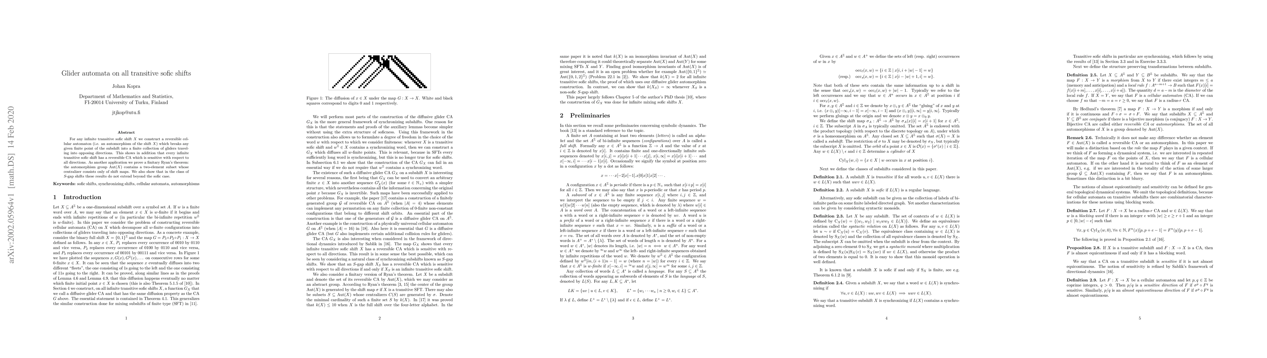 This paper constructs a reversible cellular automaton for any infinite transitive sofic shift that transforms any finite point into gliders moving in opposite directions, demonstrating sensitivity in all directions. It also proves a finitary version of Ryan's theorem for the automorphism group of such shifts.