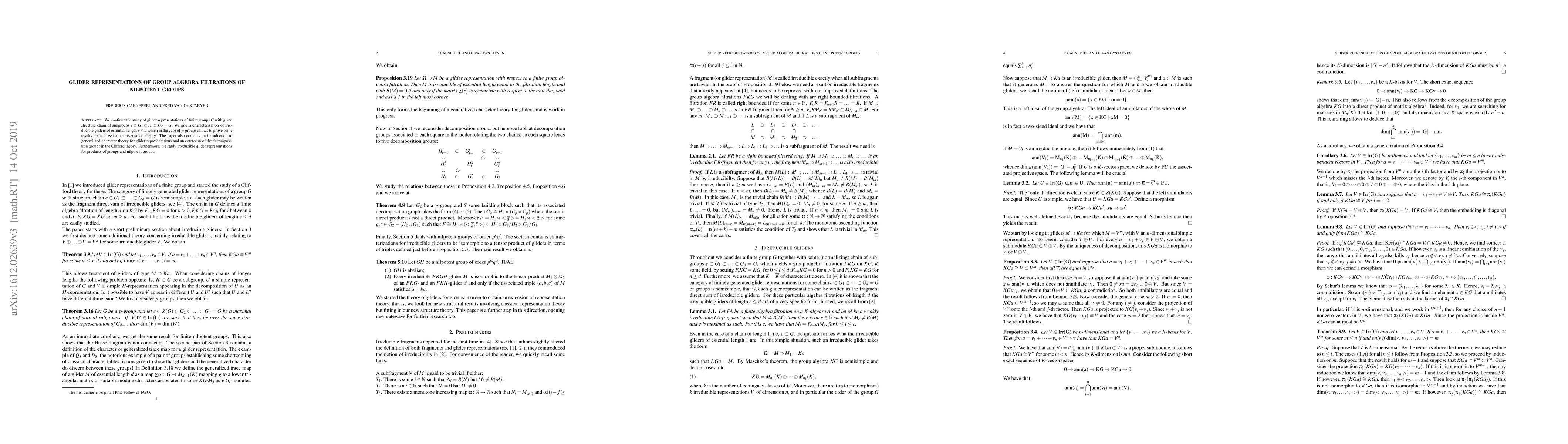 This paper characterizes irreducible glider representations of finite nilpotent groups with a specified subgroup chain, extending classical representation theory results for $p$-groups and introducing generalized character theory for gliders, along with an extension of decomposition groups in Clifford theory.