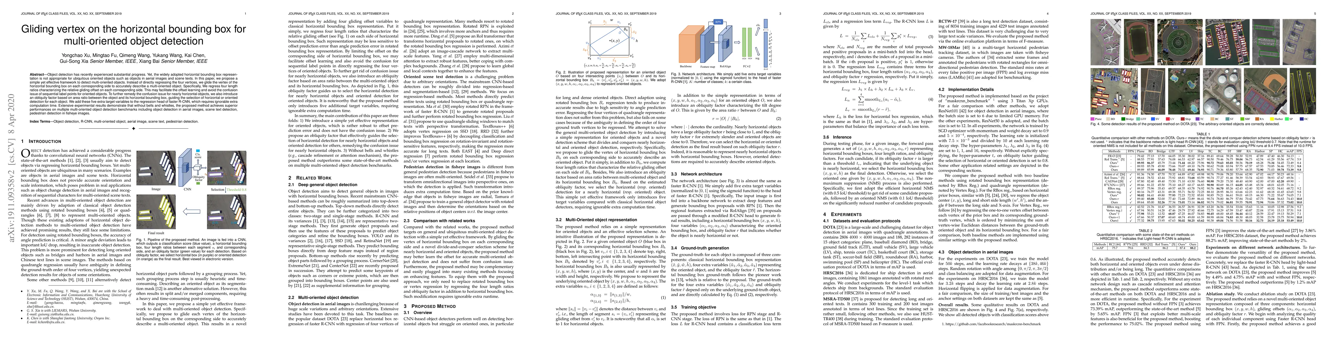 This paper proposes a novel framework for detecting multi-oriented objects by gliding the vertex of a horizontal bounding box on each side to accurately describe oriented objects. The method introduces four length ratios and an obliquity factor to avoid confusion issues, adding minimal extra computation to the faster R-CNN framework. Experimental results show superior performance on various benchmarks.