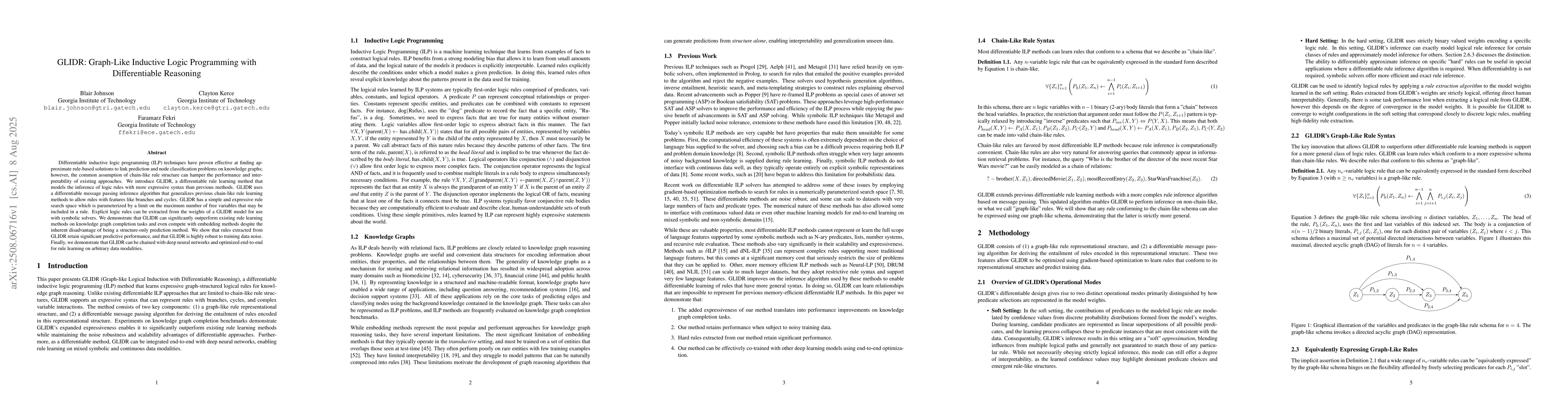 Differentiable inductive logic programming (ILP) techniques have proven effective at finding approximate rule-based solutions to link prediction and node classification problems on knowledge graphs; however, the common assumption of chain-like rule structure can hamper the performance and interpretability of existing approaches. We introduce GLIDR, a differentiable rule learning method that models the inference of logic rules with more expressive syntax than previous methods. GLIDR uses a differentiable message passing inference algorithm that generalizes previous chain-like rule learning methods to allow rules with features like branches and cycles. GLIDR has a simple and expressive rule search space which is parameterized by a limit on the maximum number of free variables that may be included in a rule. Explicit logic rules can be extracted from the weights of a GLIDR model for use with symbolic solvers. We demonstrate that GLIDR can significantly outperform existing rule learning methods on knowledge graph completion tasks and even compete with embedding methods despite the inherent disadvantage of being a structure-only prediction method. We show that rules extracted from GLIDR retain significant predictive performance, and that GLIDR is highly robust to training data noise. Finally, we demonstrate that GLIDR can be chained with deep neural networks and optimized end-to-end for rule learning on arbitrary data modalities.