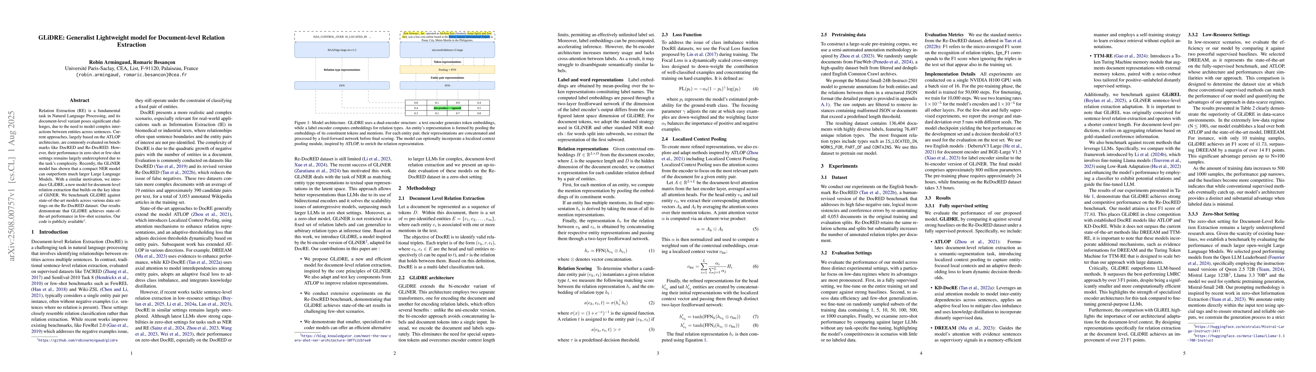 Relation Extraction (RE) is a fundamental task in Natural Language Processing, and its document-level variant poses significant challenges, due to the need to model complex interactions between entities across sentences. Current approaches, largely based on the ATLOP architecture, are commonly evaluated on benchmarks like DocRED and Re-DocRED. However, their performance in zero-shot or few-shot settings remains largely underexplored due to the task's complexity. Recently, the GLiNER model has shown that a compact NER model can outperform much larger Large Language Models. With a similar motivation, we introduce GLiDRE, a new model for document-level relation extraction that builds on the key ideas of GliNER. We benchmark GLiDRE against state-of-the-art models across various data settings on the Re-DocRED dataset. Our results demonstrate that GLiDRE achieves state-of-the-art performance in few-shot scenarios. Our code is publicly available.