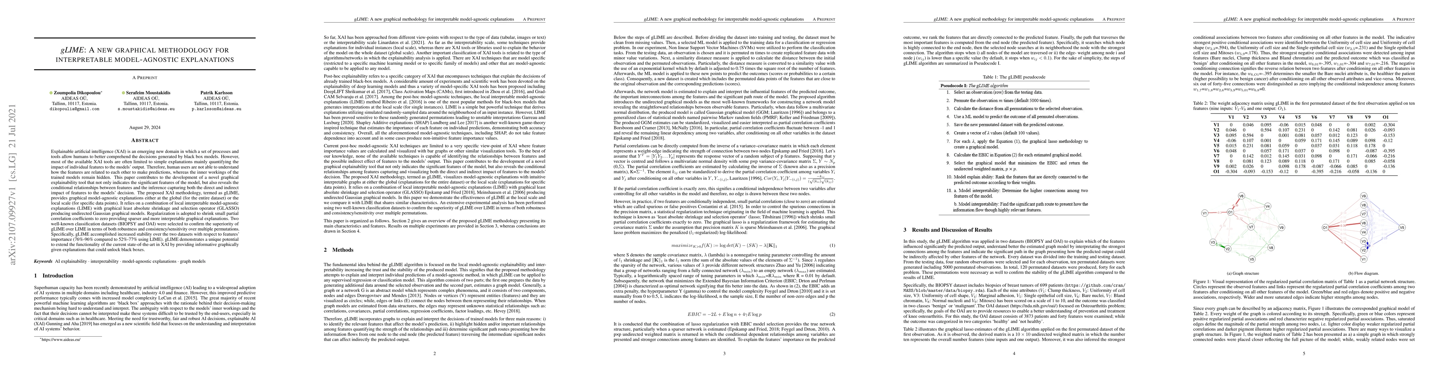 Explainable artificial intelligence (XAI) is an emerging new domain in which a set of processes and tools allow humans to better comprehend the decisions generated by black box models. However, most of the available XAI tools are often limited to simple explanations mainly quantifying the impact of individual features to the models' output. Therefore, human users are not able to understand how the features are related to each other to make predictions, whereas the inner workings of the trained models remain hidden. This paper contributes to the development of a novel graphical explainability tool that not only indicates the significant features of the model but also reveals the conditional relationships between features and the inference capturing both the direct and indirect impact of features to the models' decision. The proposed XAI methodology, termed as gLIME, provides graphical model-agnostic explanations either at the global (for the entire dataset) or the local scale (for specific data points). It relies on a combination of local interpretable model-agnostic explanations (LIME) with graphical least absolute shrinkage and selection operator (GLASSO) producing undirected Gaussian graphical models. Regularization is adopted to shrink small partial correlation coefficients to zero providing sparser and more interpretable graphical explanations. Two well-known classification datasets (BIOPSY and OAI) were selected to confirm the superiority of gLIME over LIME in terms of both robustness and consistency over multiple permutations. Specifically, gLIME accomplished increased stability over the two datasets with respect to features' importance (76%-96% compared to 52%-77% using LIME). gLIME demonstrates a unique potential to extend the functionality of the current state-of-the-art in XAI by providing informative graphically given explanations that could unlock black boxes.