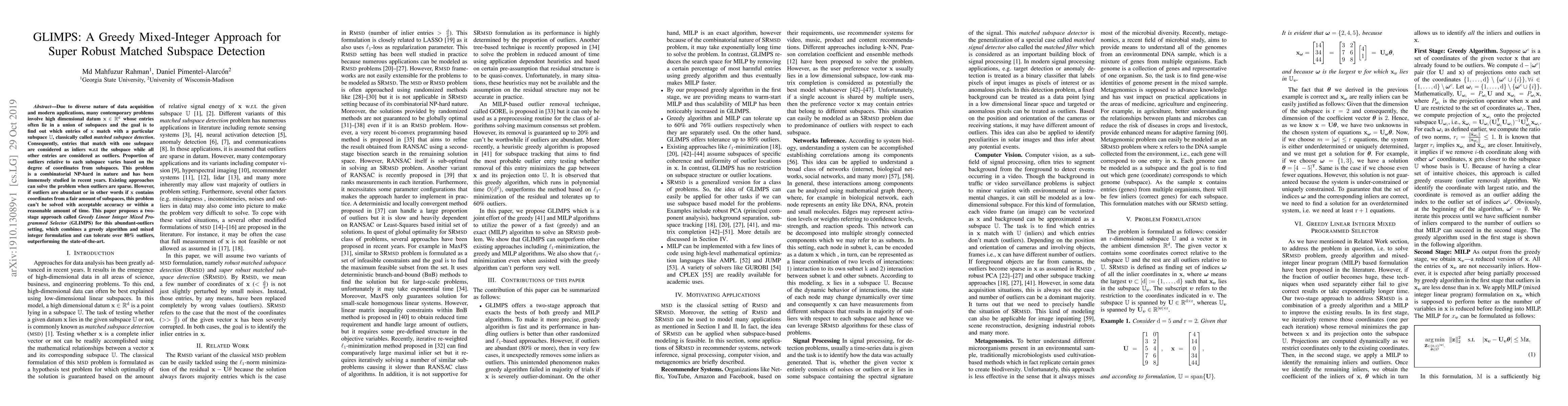 This paper introduces GLIMPS, a two-stage greedy mixed integer approach for detecting matched subspaces in high-dimensional data with abundant outliers. It outperforms existing methods by tolerating over 80% outliers, addressing the combinatorial NP-hard problem of matched subspace detection.