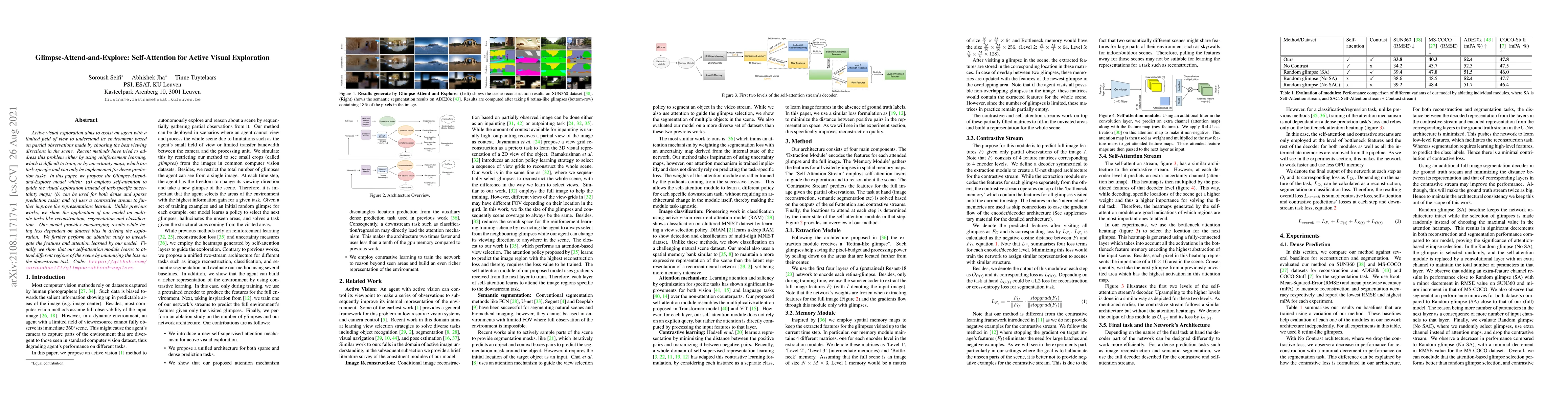 Active visual exploration aims to assist an agent with a limited field of view to understand its environment based on partial observations made by choosing the best viewing directions in the scene. Recent methods have tried to address this problem either by using reinforcement learning, which is difficult to train, or by uncertainty maps, which are task-specific and can only be implemented for dense prediction tasks. In this paper, we propose the Glimpse-Attend-and-Explore model which: (a) employs self-attention to guide the visual exploration instead of task-specific uncertainty maps; (b) can be used for both dense and sparse prediction tasks; and (c) uses a contrastive stream to further improve the representations learned. Unlike previous works, we show the application of our model on multiple tasks like reconstruction, segmentation and classification. Our model provides encouraging results while being less dependent on dataset bias in driving the exploration. We further perform an ablation study to investigate the features and attention learned by our model. Finally, we show that our self-attention module learns to attend different regions of the scene by minimizing the loss on the downstream task. Code: https://github.com/soroushseifi/glimpse-attend-explore.