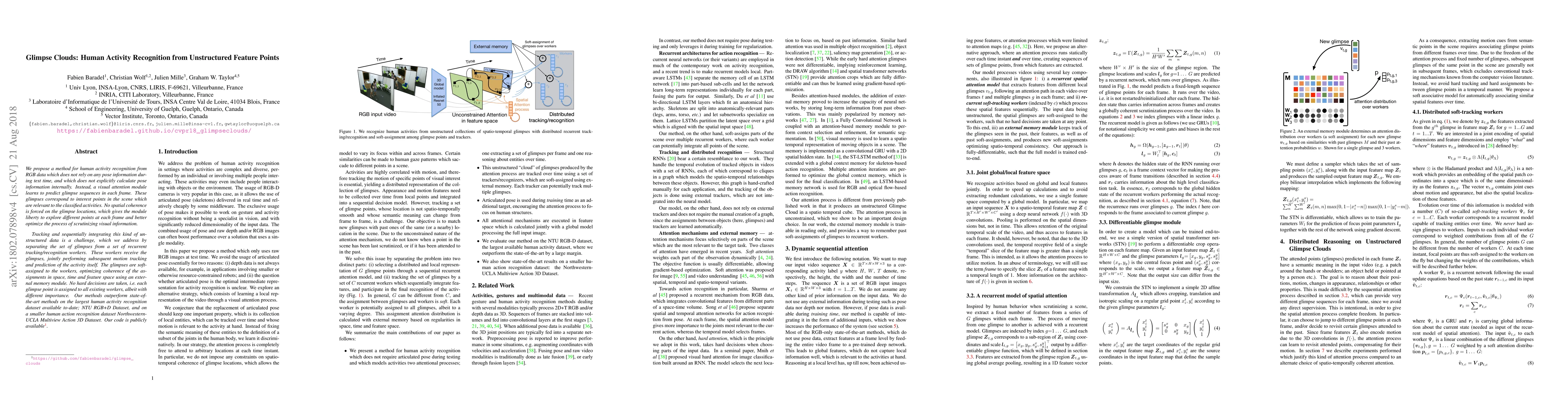 We propose a method for human activity recognition from RGB data that does not rely on any pose information during test time and does not explicitly calculate pose information internally. Instead, a visual attention module learns to predict glimpse sequences in each frame. These glimpses correspond to interest points in the scene that are relevant to the classified activities. No spatial coherence is forced on the glimpse locations, which gives the module liberty to explore different points at each frame and better optimize the process of scrutinizing visual information. Tracking and sequentially integrating this kind of unstructured data is a challenge, which we address by separating the set of glimpses from a set of recurrent tracking/recognition workers. These workers receive glimpses, jointly performing subsequent motion tracking and activity prediction. The glimpses are soft-assigned to the workers, optimizing coherence of the assignments in space, time and feature space using an external memory module. No hard decisions are taken, i.e. each glimpse point is assigned to all existing workers, albeit with different importance. Our methods outperform state-of-the-art methods on the largest human activity recognition dataset available to-date; NTU RGB+D Dataset, and on a smaller human action recognition dataset Northwestern-UCLA Multiview Action 3D Dataset. Our code is publicly available at https://github.com/fabienbaradel/glimpse_clouds.
