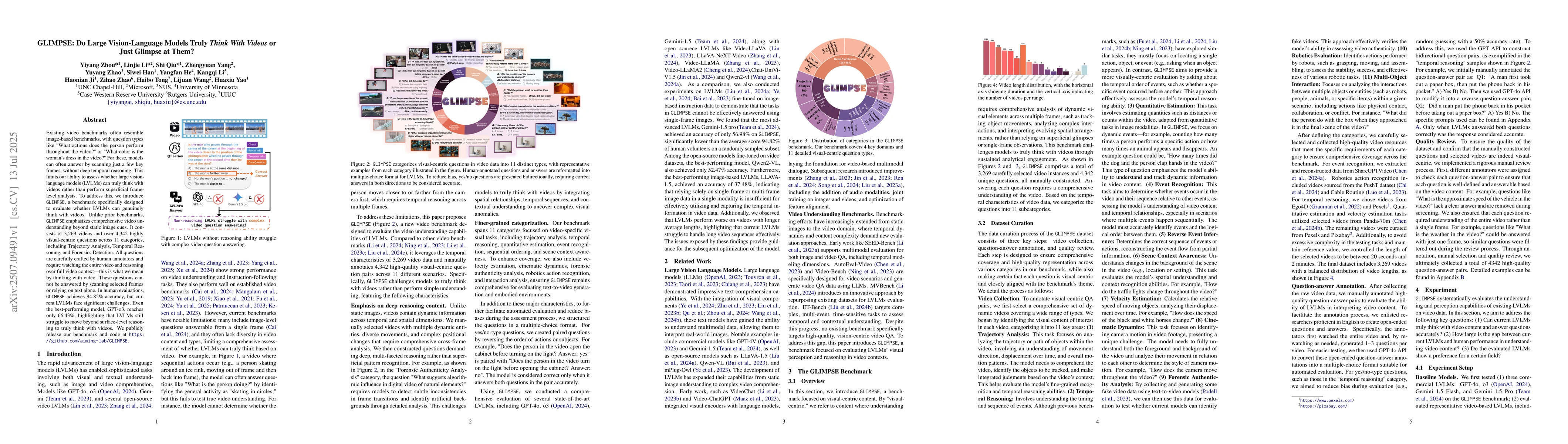 Existing video benchmarks often resemble image-based benchmarks, with question types like "What actions does the person perform throughout the video?" or "What color is the woman's dress in the video?" For these, models can often answer by scanning just a few key frames, without deep temporal reasoning. This limits our ability to assess whether large vision-language models (LVLMs) can truly think with videos rather than perform superficial frame-level analysis. To address this, we introduce GLIMPSE, a benchmark specifically designed to evaluate whether LVLMs can genuinely think with videos. Unlike prior benchmarks, GLIMPSE emphasizes comprehensive video understanding beyond static image cues. It consists of 3,269 videos and over 4,342 highly visual-centric questions across 11 categories, including Trajectory Analysis, Temporal Reasoning, and Forensics Detection. All questions are carefully crafted by human annotators and require watching the entire video and reasoning over full video context-this is what we mean by thinking with video. These questions cannot be answered by scanning selected frames or relying on text alone. In human evaluations, GLIMPSE achieves 94.82% accuracy, but current LVLMs face significant challenges. Even the best-performing model, GPT-o3, reaches only 66.43%, highlighting that LVLMs still struggle to move beyond surface-level reasoning to truly think with videos.